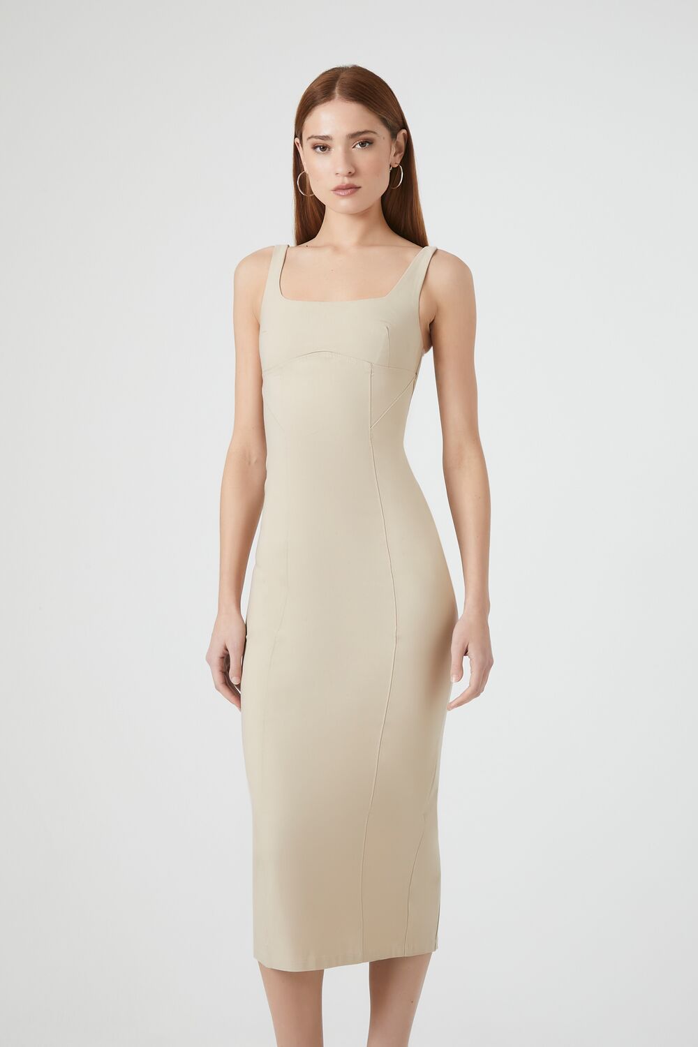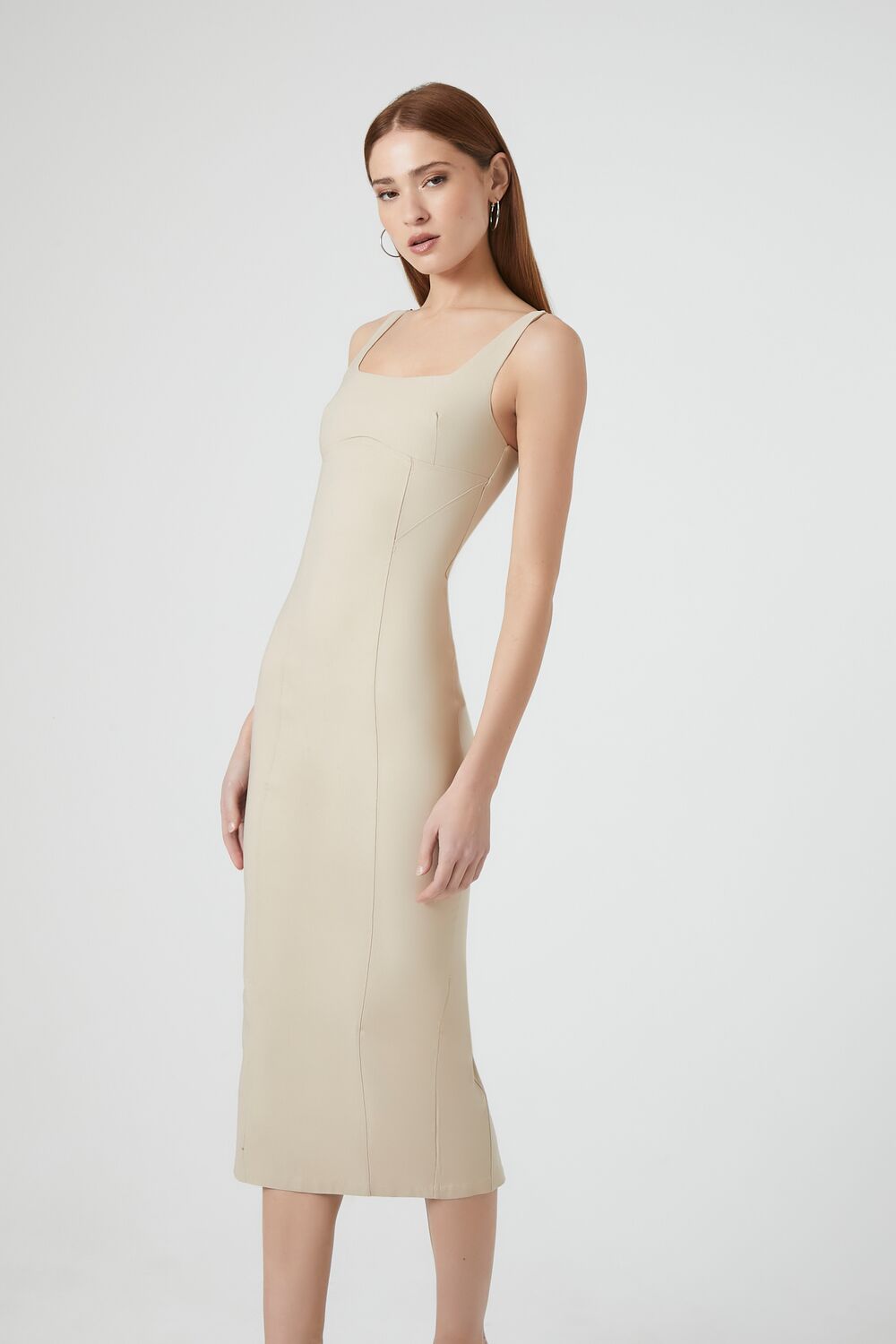 A knit tank midi dress featuring a seamed construction. square-cut neckline and back. shoulder straps. split back hem. bodycon silhouette. and a concealed back zipper.