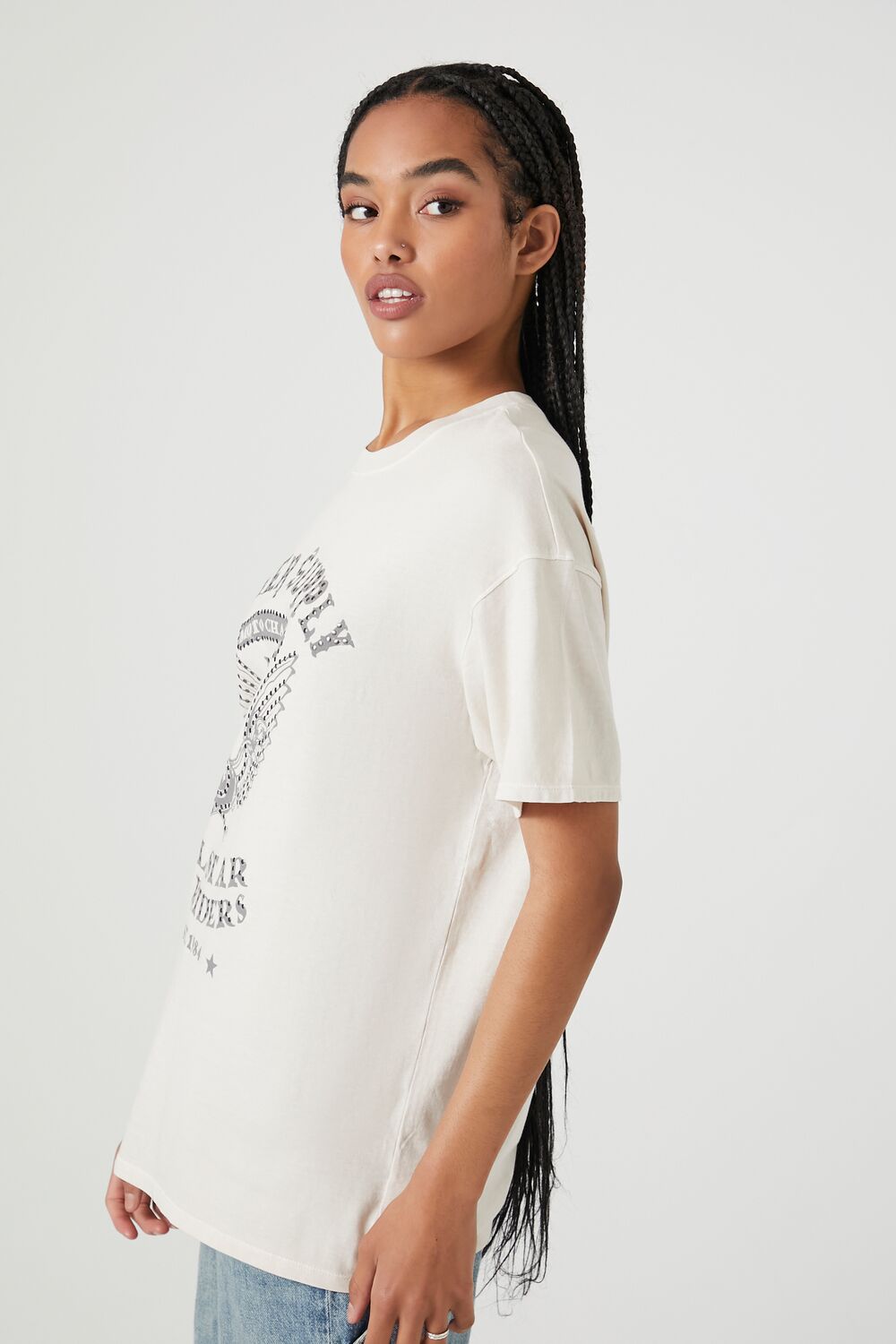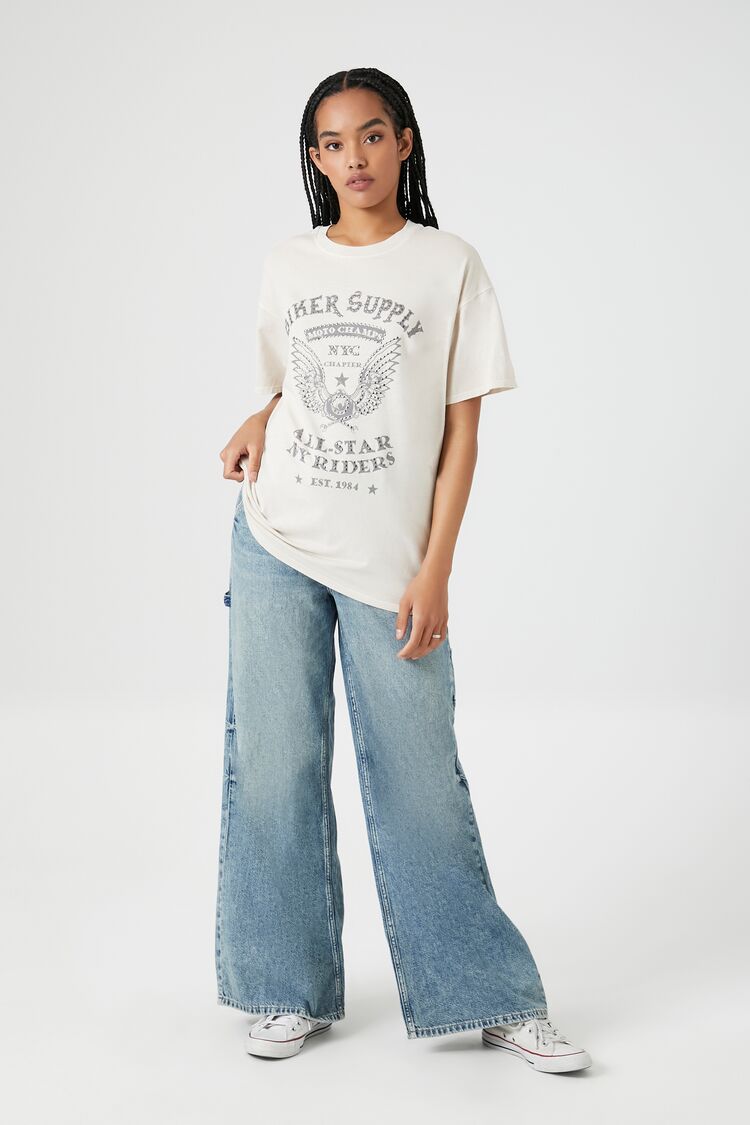A knit tee featuring 'Biker Supply'. 'All-Star NY Riders'. and various text. oversized fit. accompanying winged graphic. front stud embellishments. dropped short sleeves. and a crew neck.