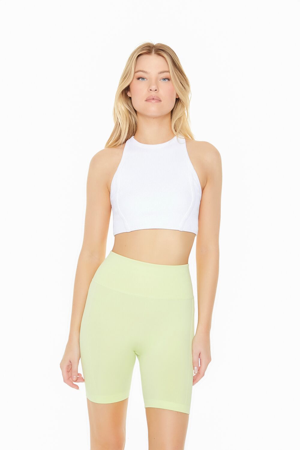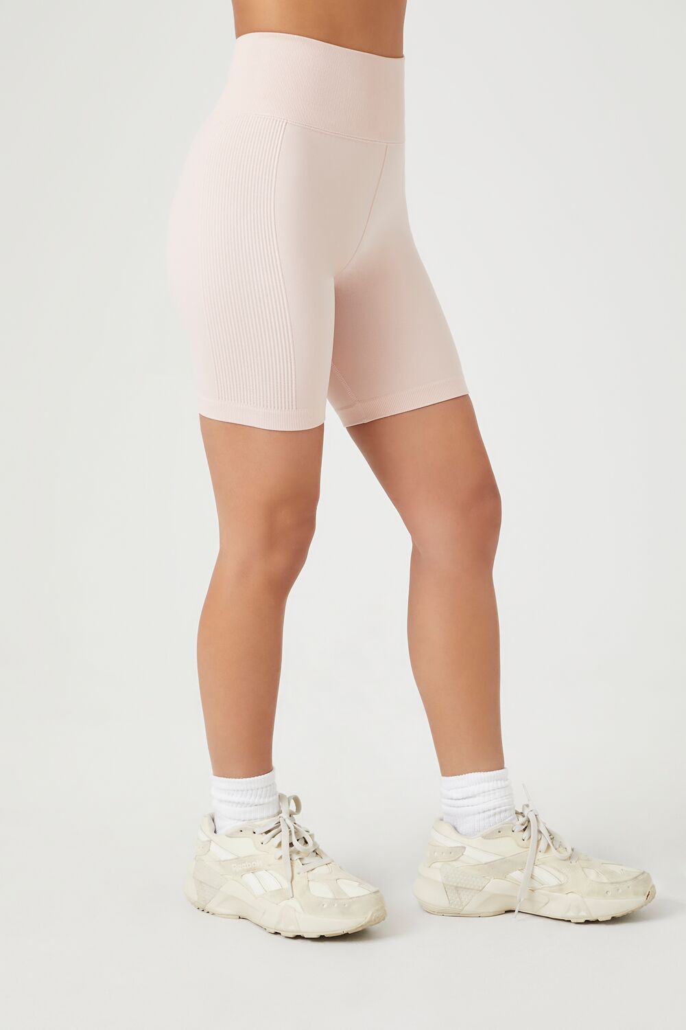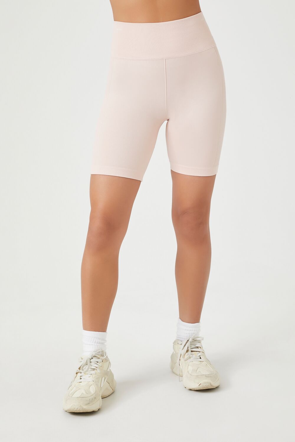A pair of athletic knit biker shorts featuring a high-rise waist. seamless fit that sculpts. lifts. and smooths. breathable and moisture wicking fabric. and seams that lay flat for ultimate comfort.