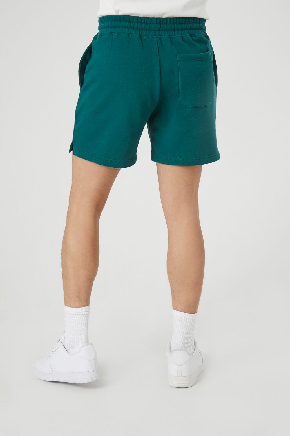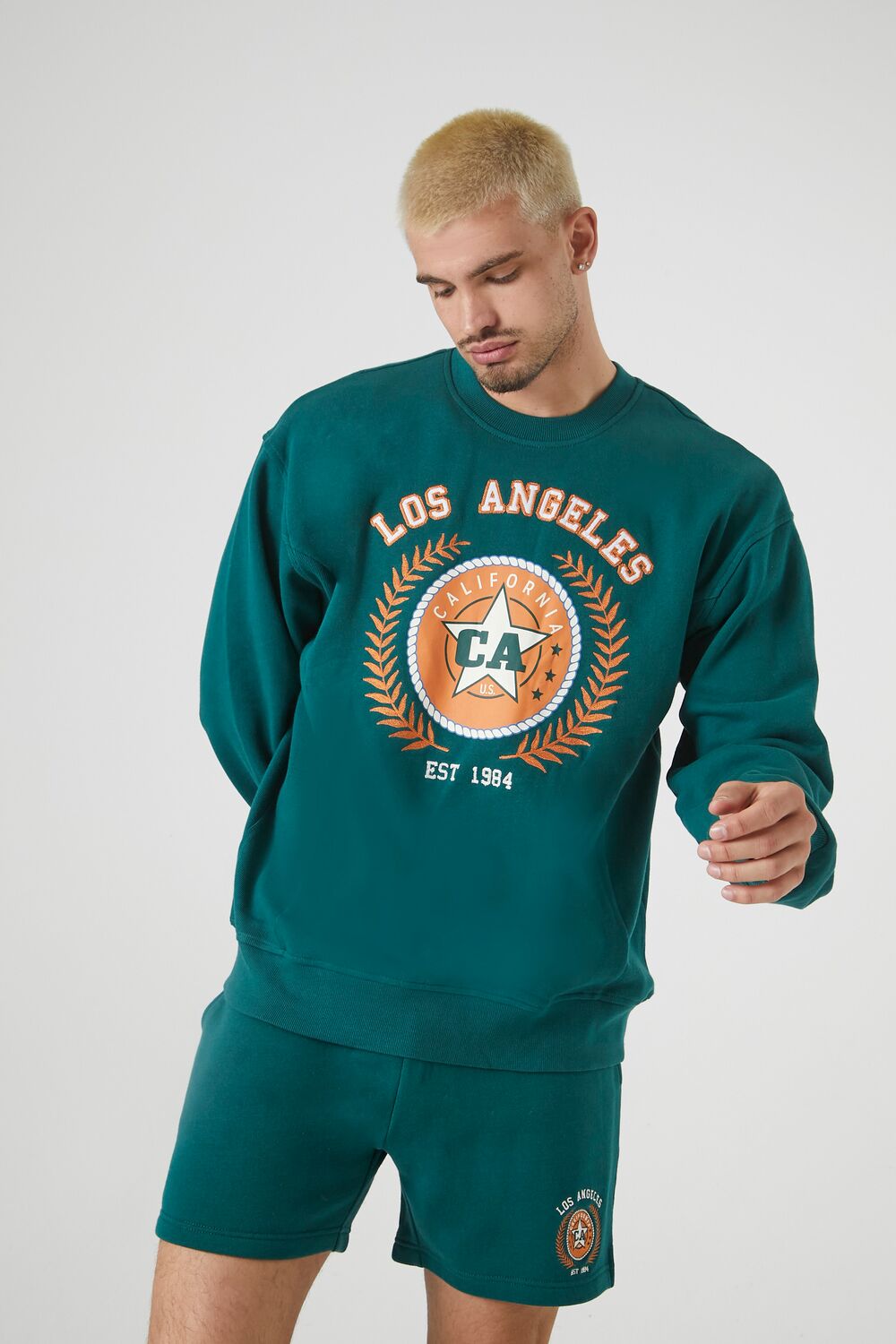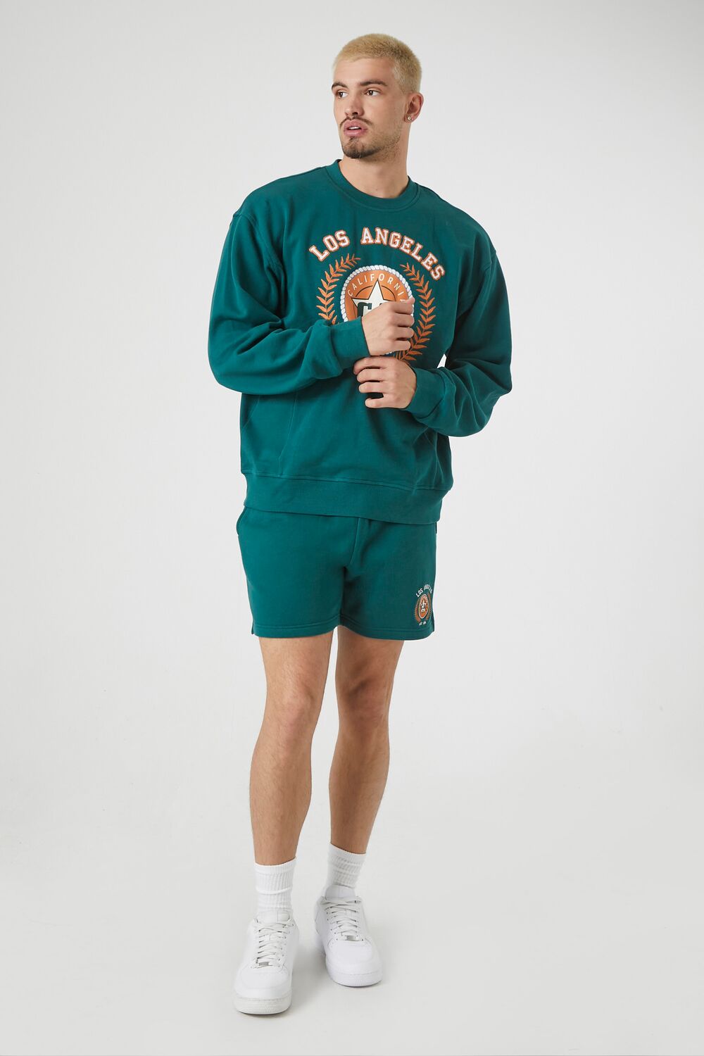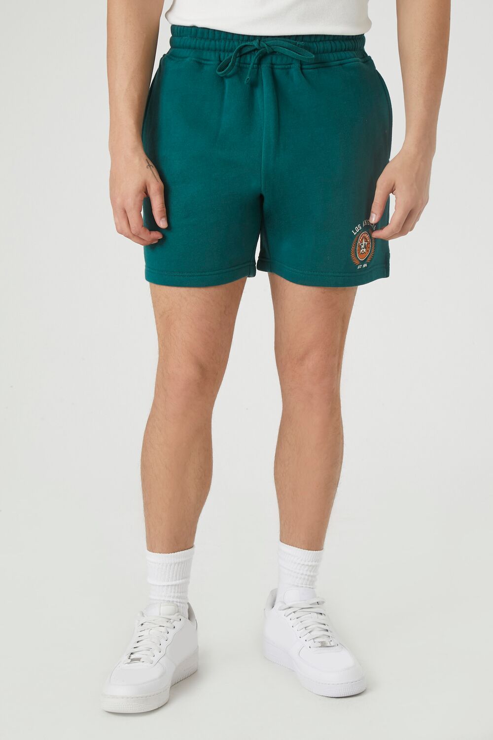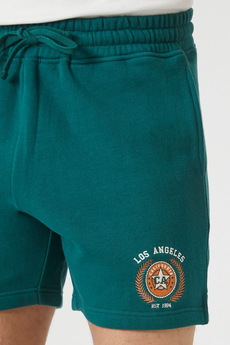 A pair of knit shorts featuring a drawstring waist. leg 'Los Angeles' and various text. accompanying emblem graphic. and on-seam and back patch pockets.