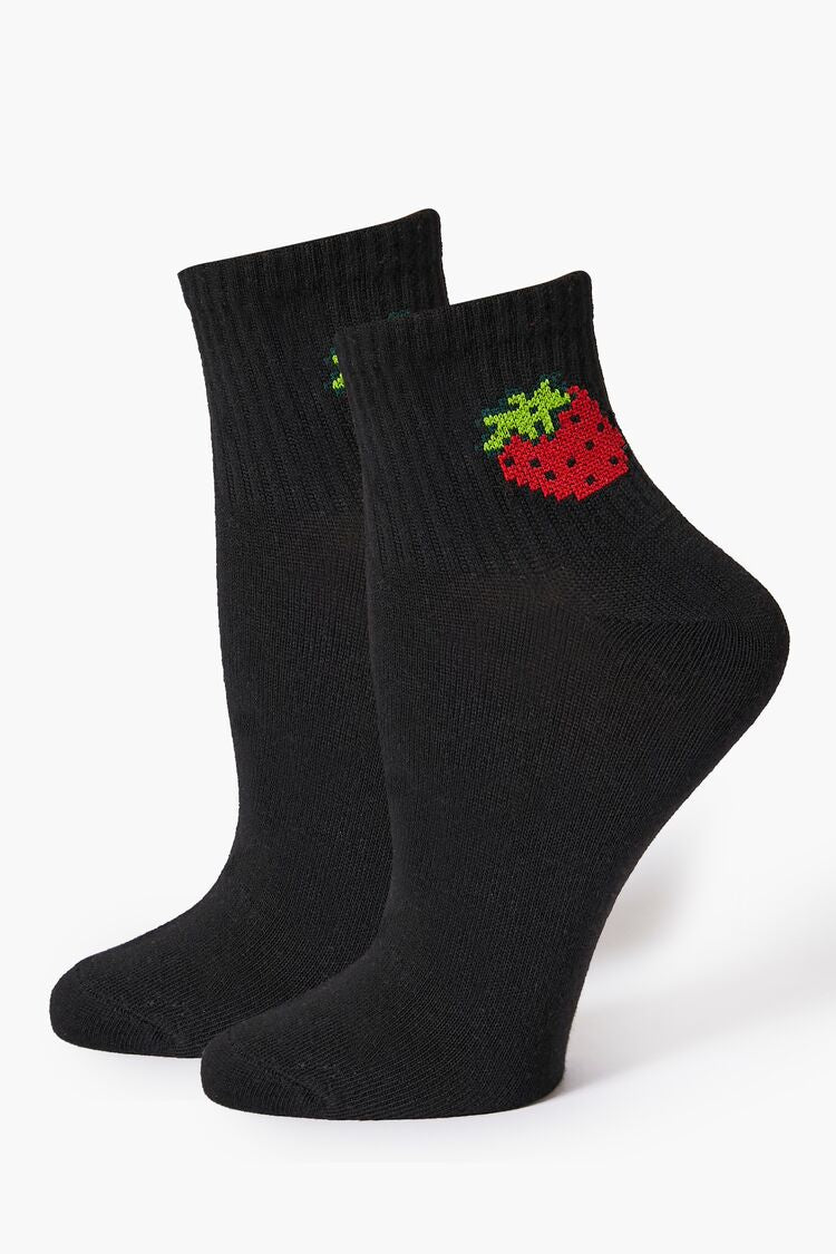 A pair of knit socks featuring a quarter length and strawberry design.