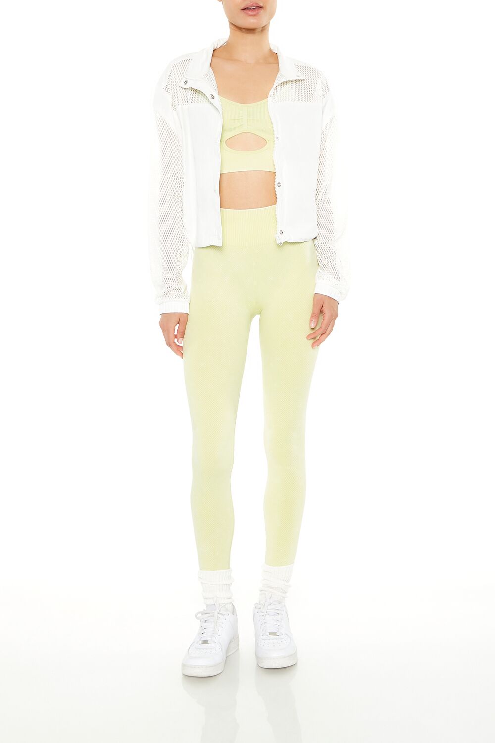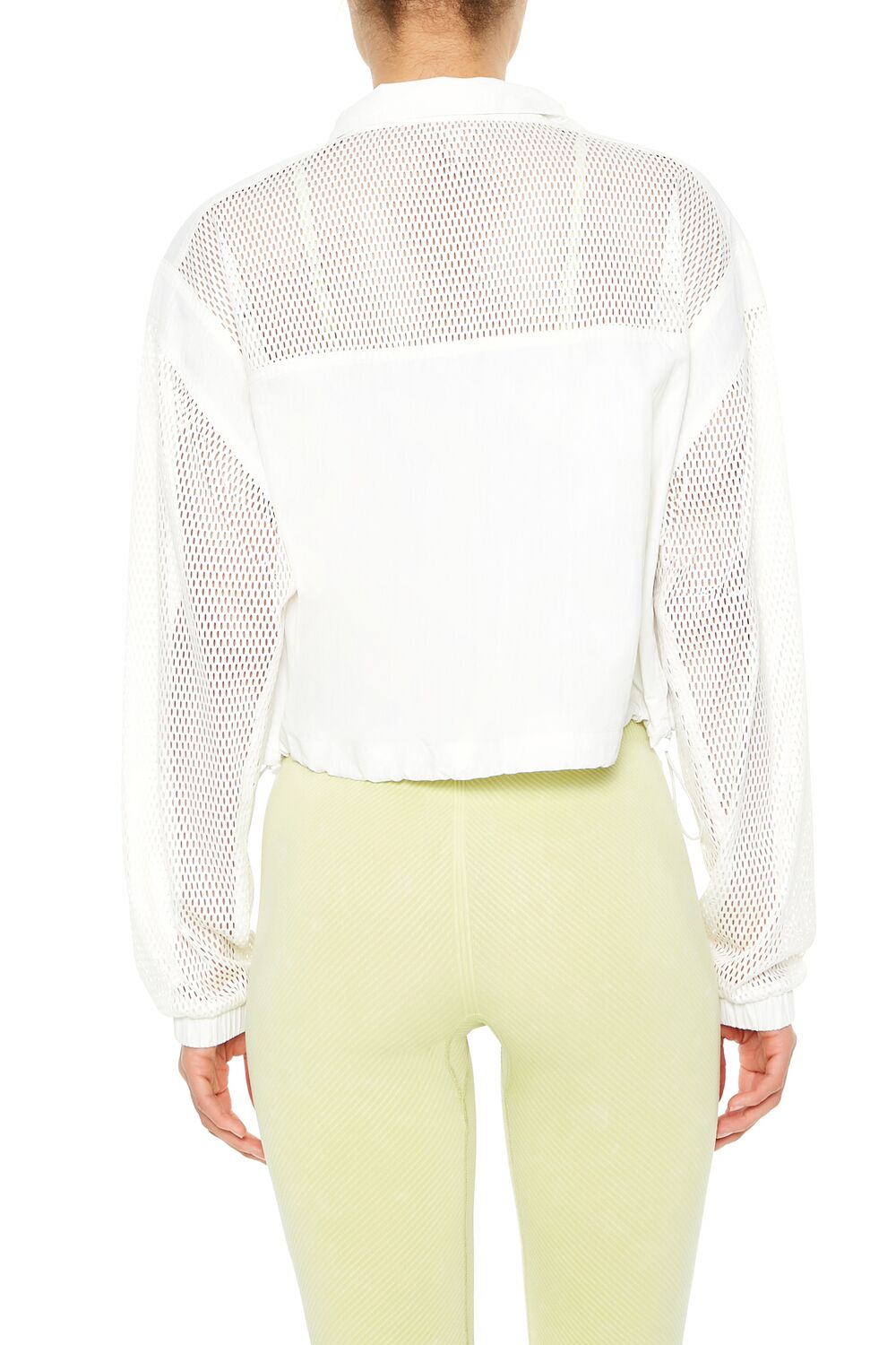 An athletic woven jacket featuring a partial netted construction. mock neck. zip-up and snap-button front closures. and dropped long sleeves.