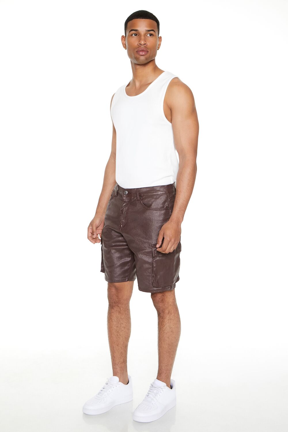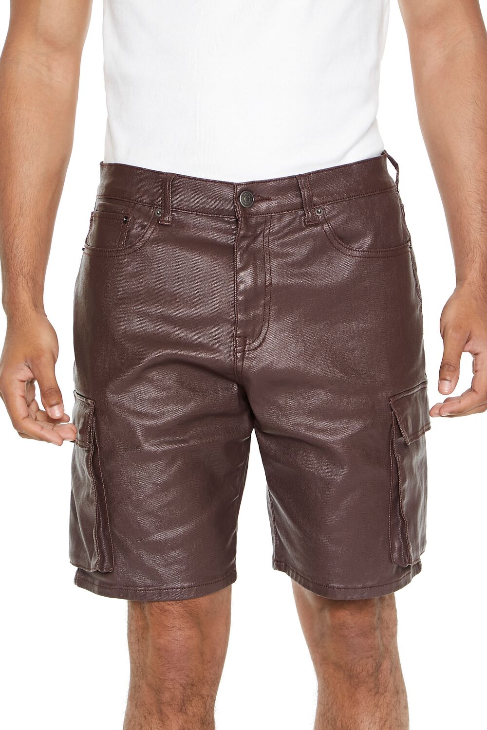 Crafted from stretch-denim. this pair of shorts features a five-pocket construction. belt loops. and a coated finish.