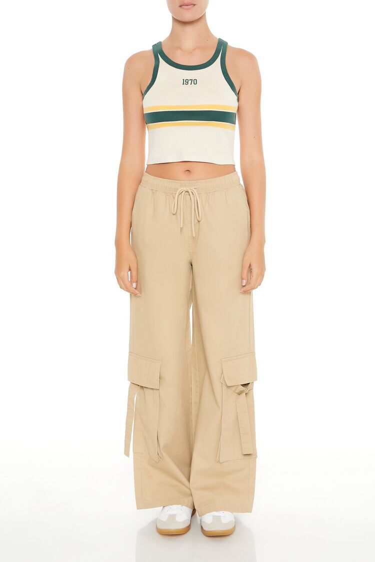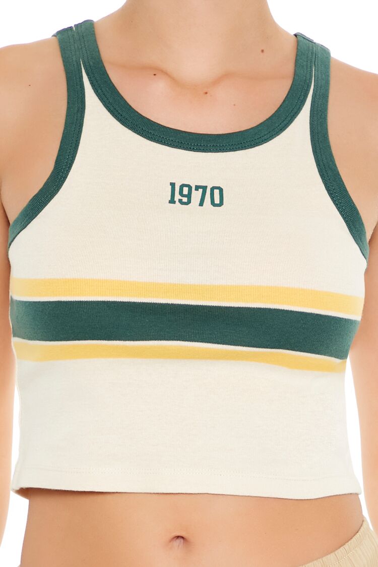 A ribbed knit tank top featuring a round neckline. front '1970' text. front striped pattern. and cropped hem.