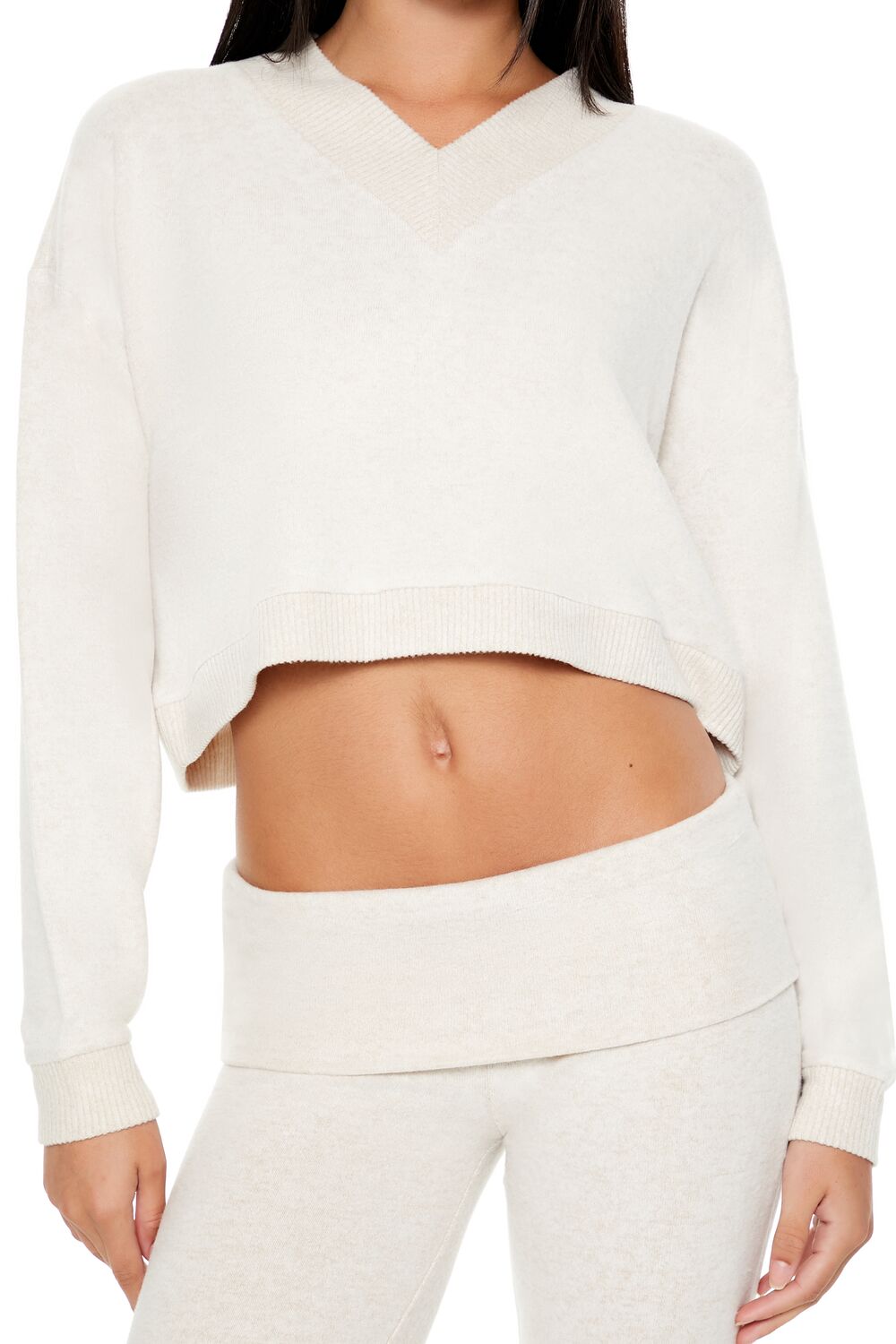 A knit pajama pullover featuring ribbed trim. a V-neckline. dropped long sleeves. cropped hem. and boxy fit.