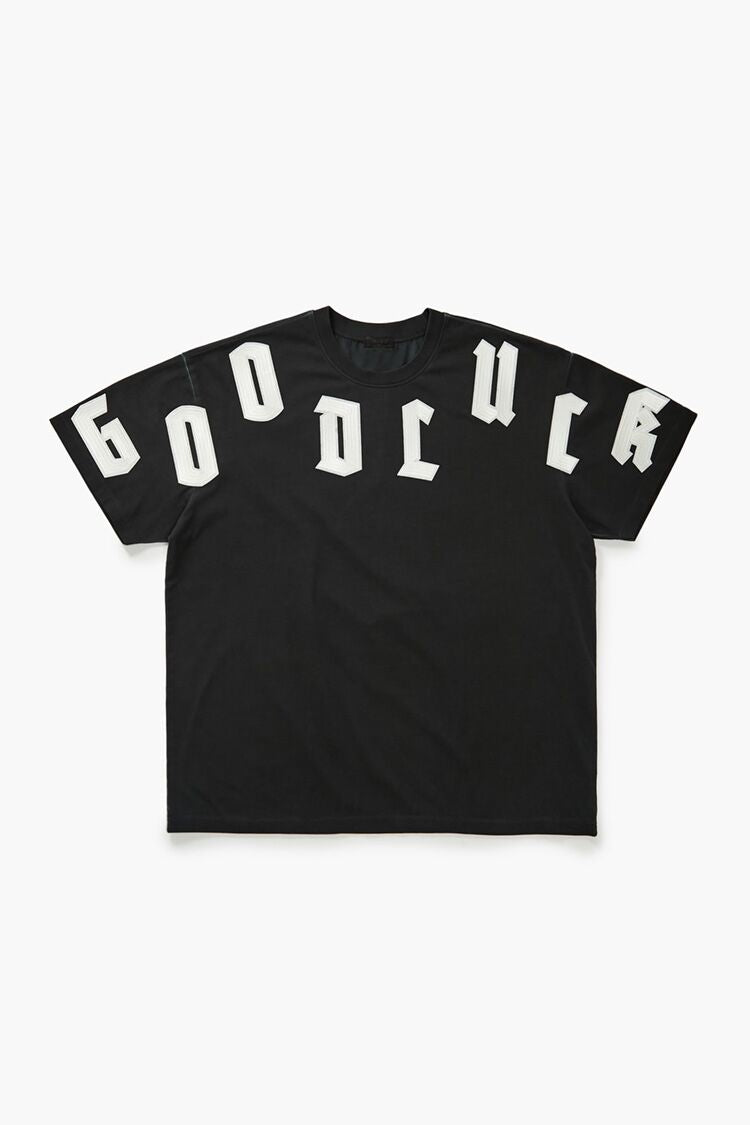 A knit unisex tee featuring a crew neck. front 'Good Luck' embroidered applique. and short sleeves.