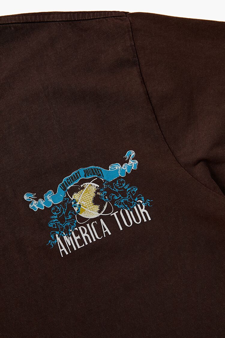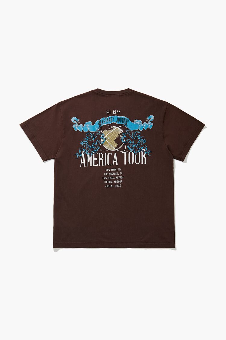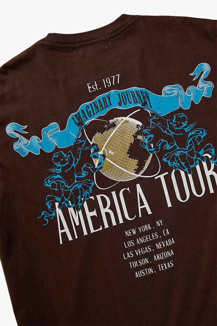 A knit unisex tee featuring a crew neck. chest and back 'Imaginary Journey' and 'American Tour' text and geometric. angel. and banner graphics. short sleeves. and back 'Est. 1977' and city text.