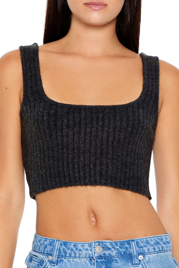 A chenille sweater set featuring a cropped tank top with a square-cut neckline. as well as a cardigan sweater with long sleeves and button-front closures.