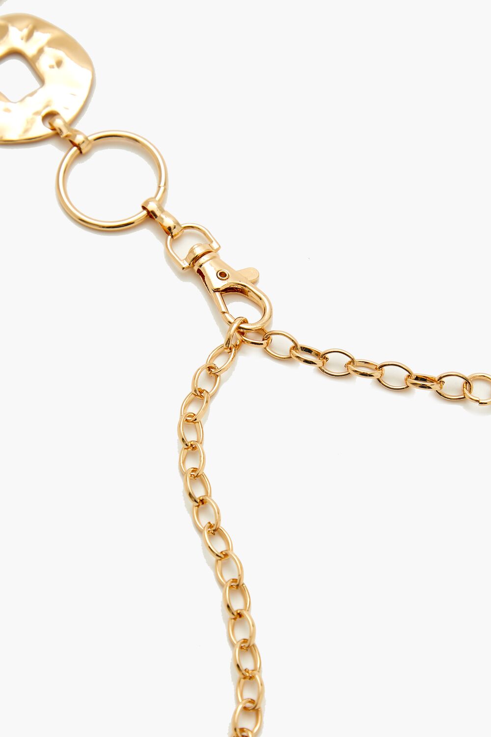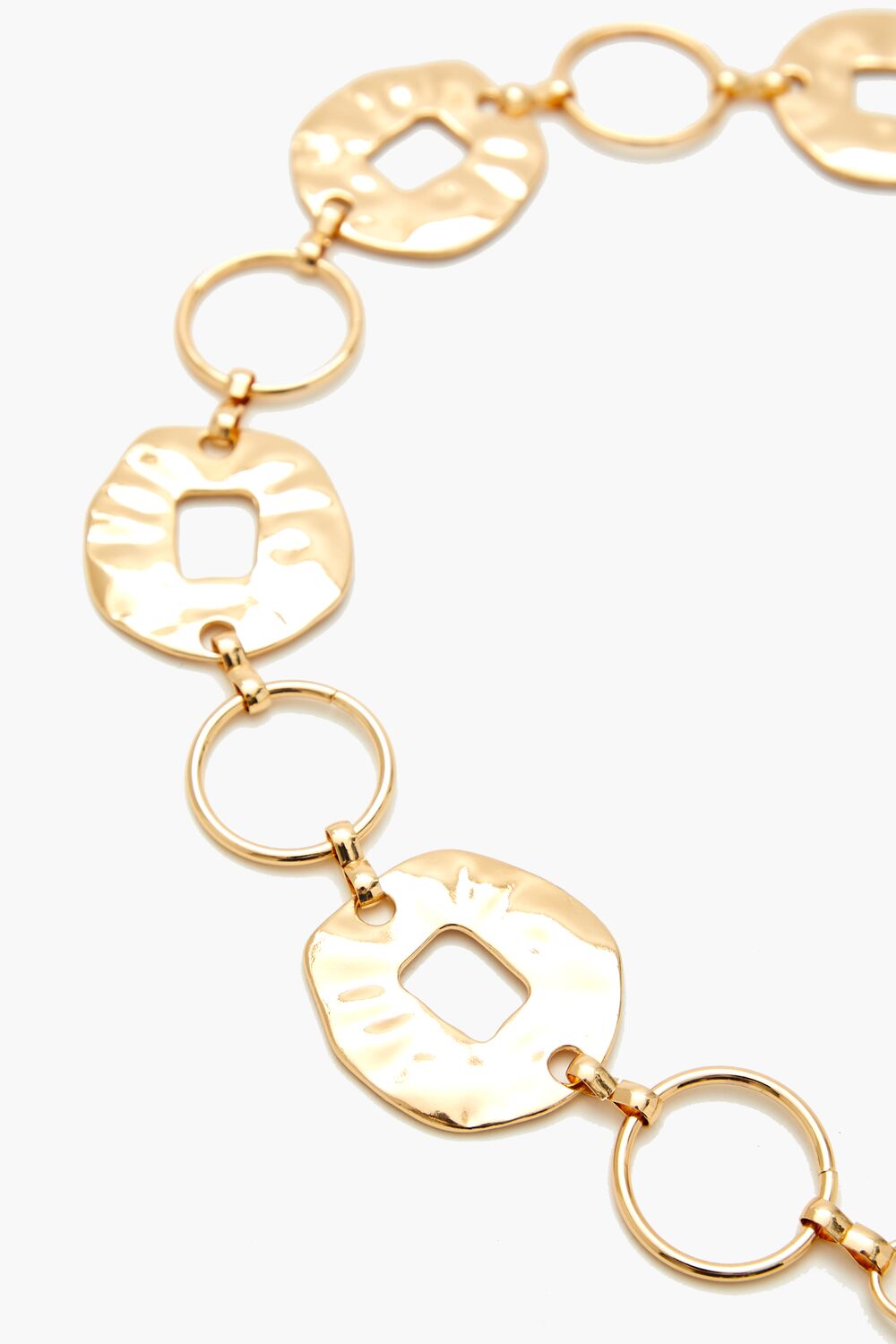 A high-polish belt featuring a rolo chain. hammered finish. and lobster-clasp closure.