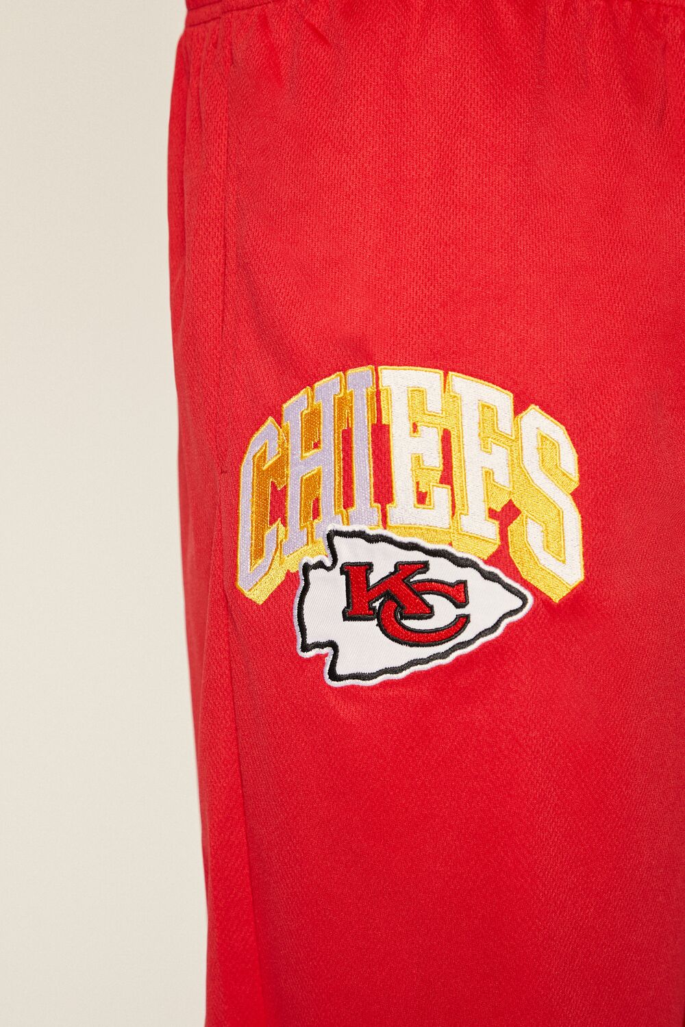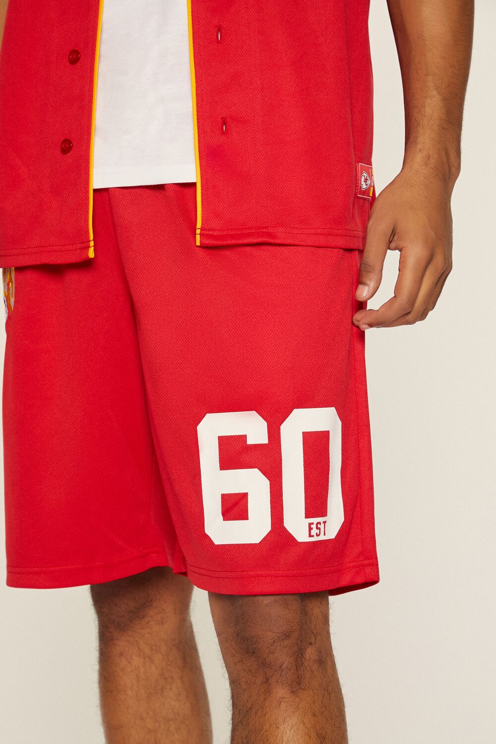 A pair of mesh knit shorts featuring 'Chiefs' and 'KC' embroidery. a drawstring waist. and 'Est. 60' front graphic. (Officially licensed product)