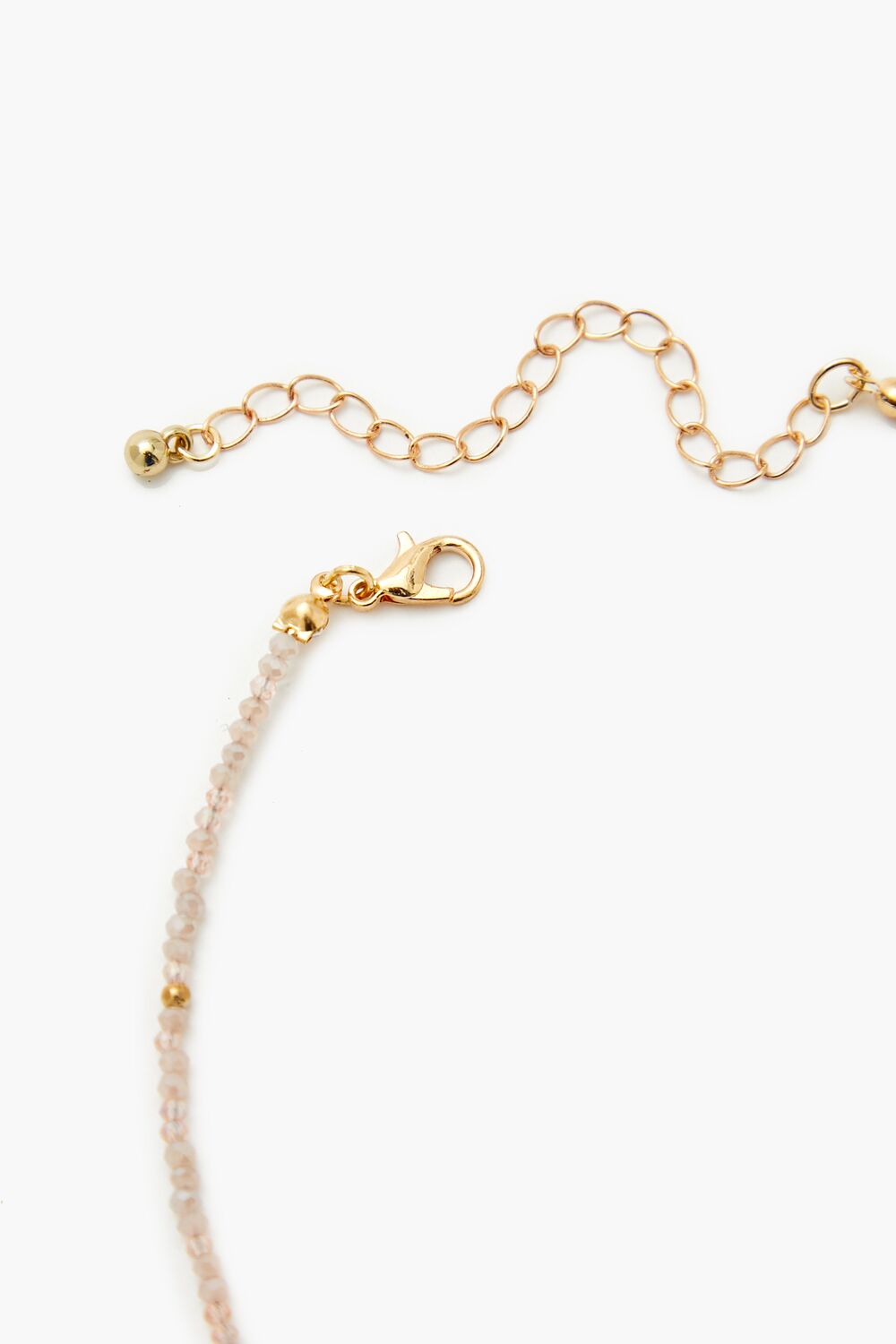A high-polish necklace featuring bead and rhinestone embellishments. a cross charm. and lobster-clasp closure.