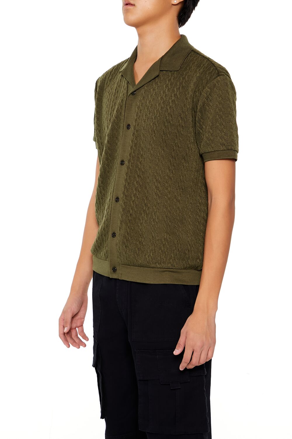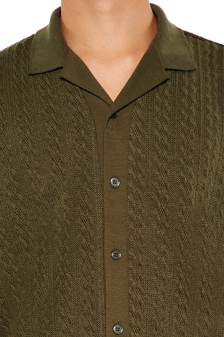 A cable sweater-knit shirt featuring a Cuban collar. button-front closures. and short sleeves.