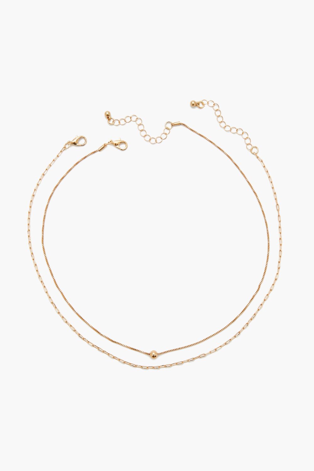 A high-polish necklace set featuring box and anchor chains. a bead embellishment. and lobster clasp closures.