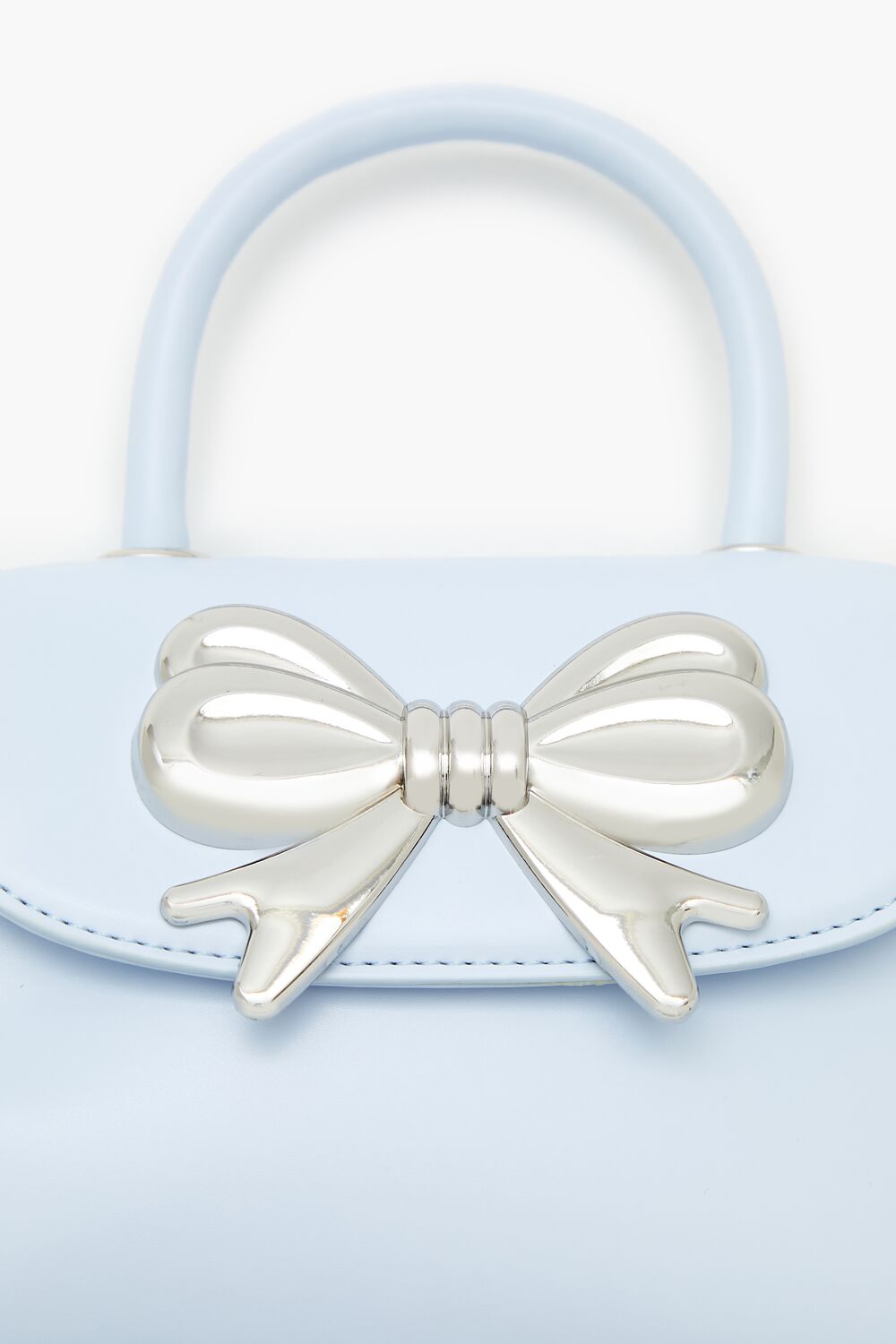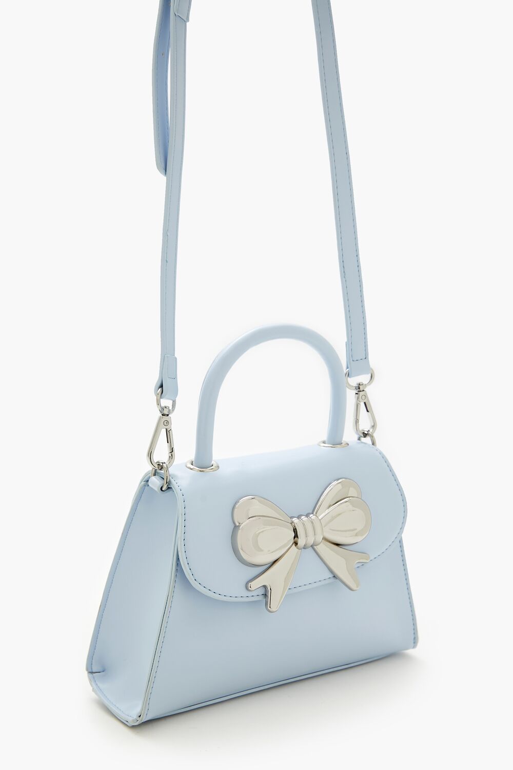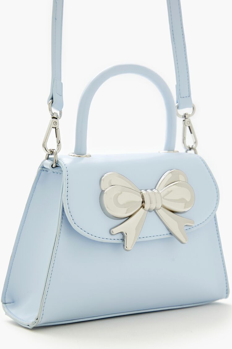 A faux leather crossbody bag featuring a small structured body. flap top with high-polish bow embellishment and magnetic closure. top handle. and removable adjustable shoulder strap.