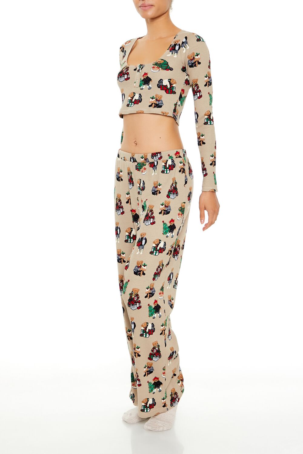 A pair of thermal knit pajama pants featuring allover Christmas-themed teddy bear graphics. an elasticized mid-rise waist. partial button-front placket. and wide leg.