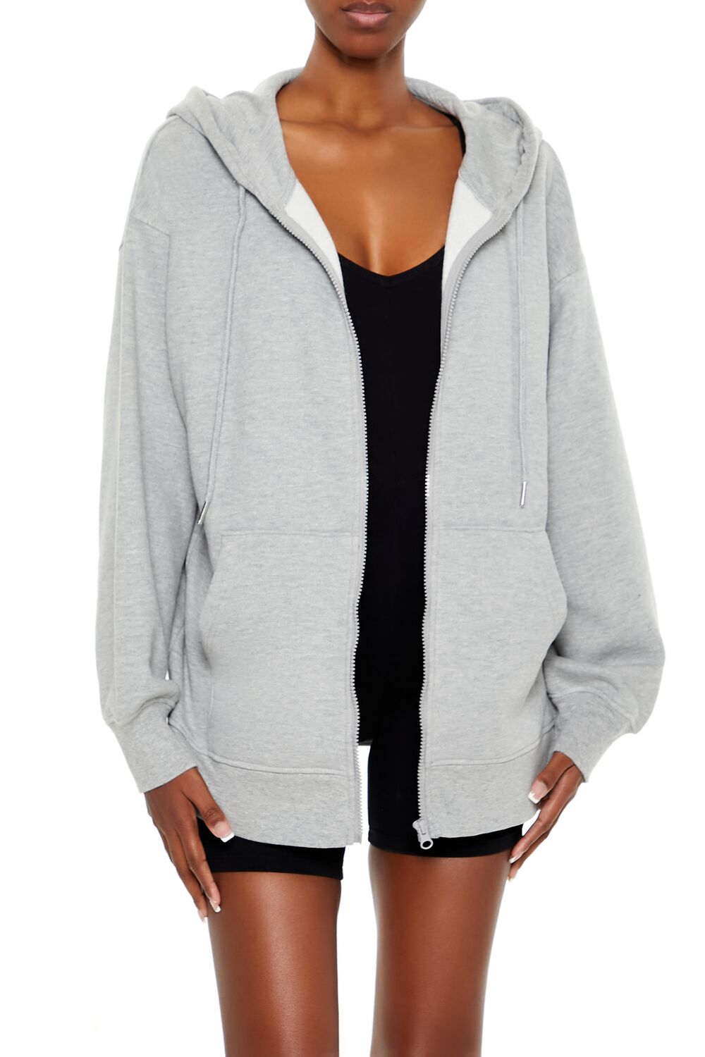 A fleece zip-up hoodie featuring a drawstring hood with high-polish aglets. split kangaroo front pocket. dropped long sleeves. and oversized fit.