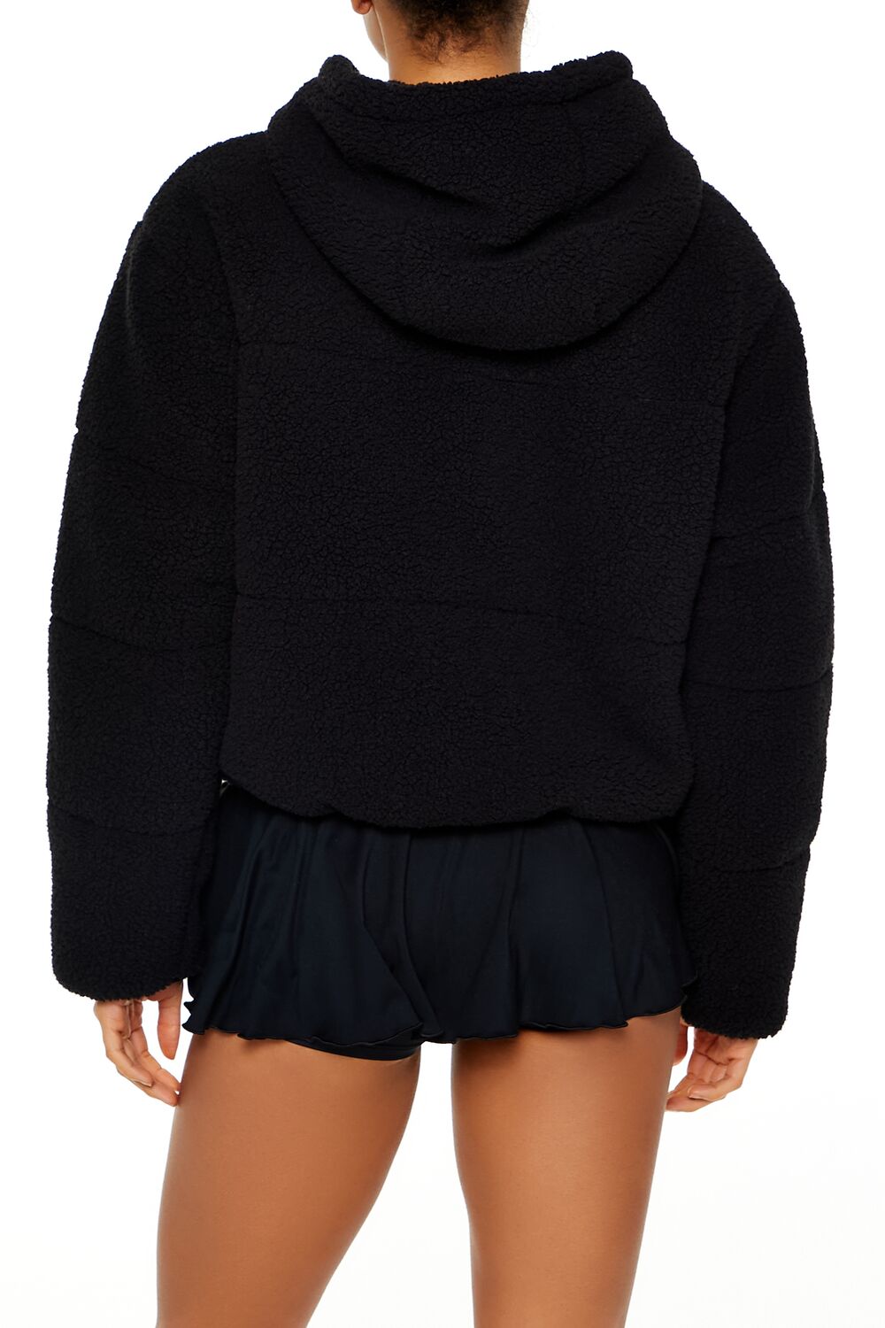 An athletic faux shearling jacket featuring a quilted channel-stitched construction. drawstring hood. concealed zip-up and snap button-front closures. slanted front pockets. and dropped long sleeves.
