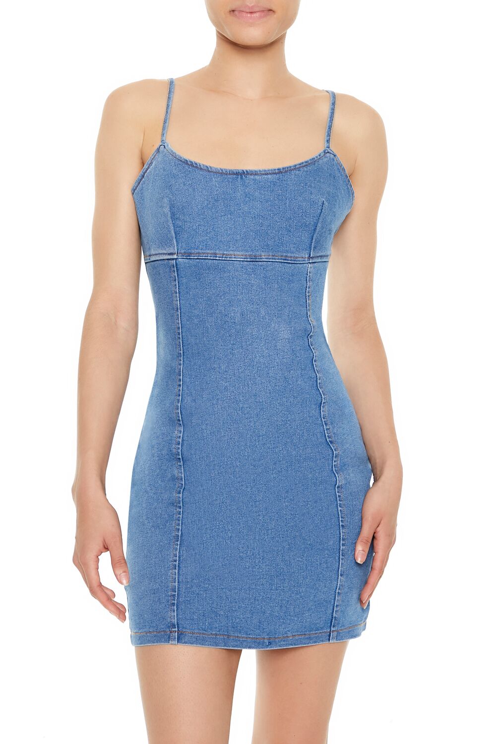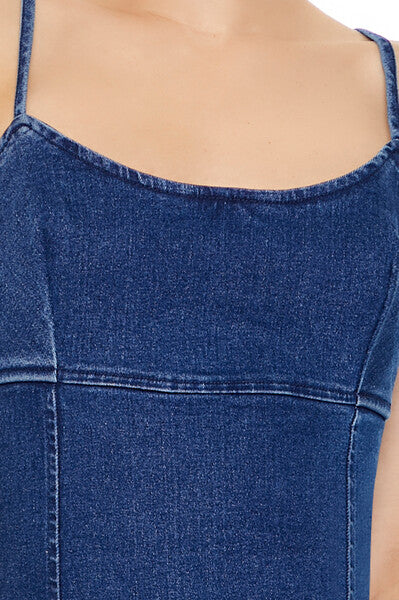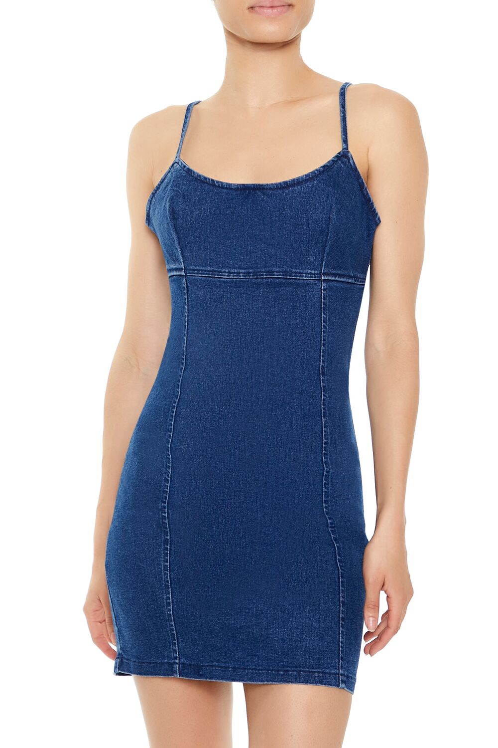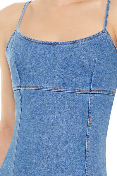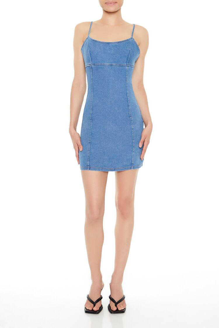 Crafted from stretch-denim. this mini dress features a scoop neckline. adjustable cami straps. straight-cut back with exposed zipper closure. and bodycon silhouette.
