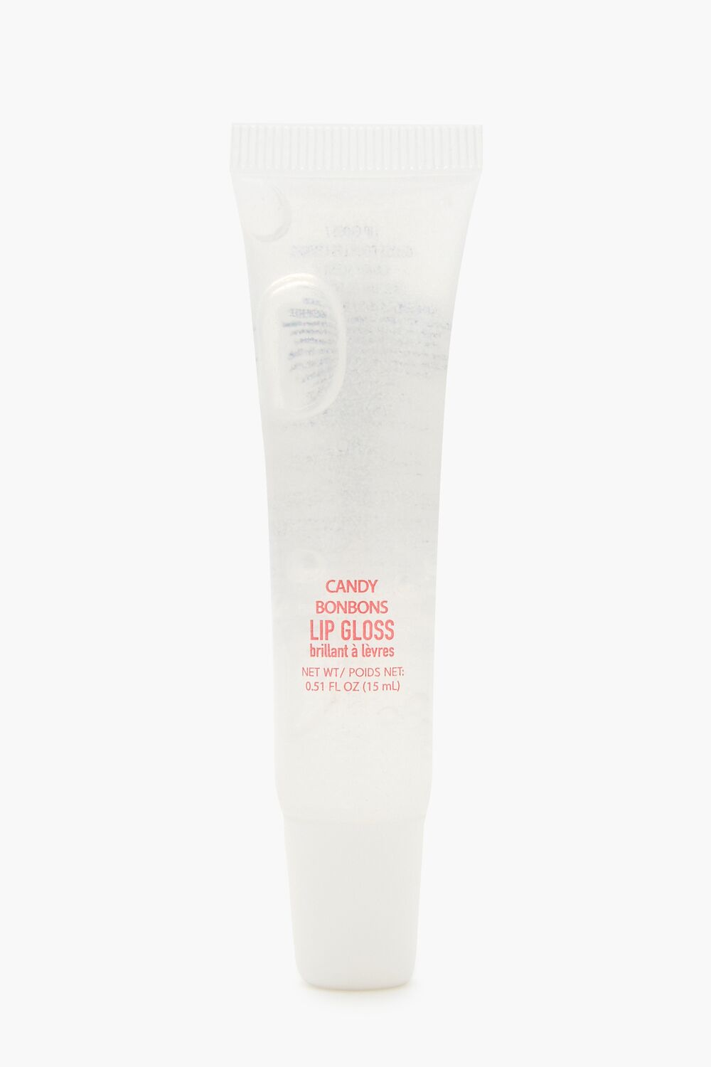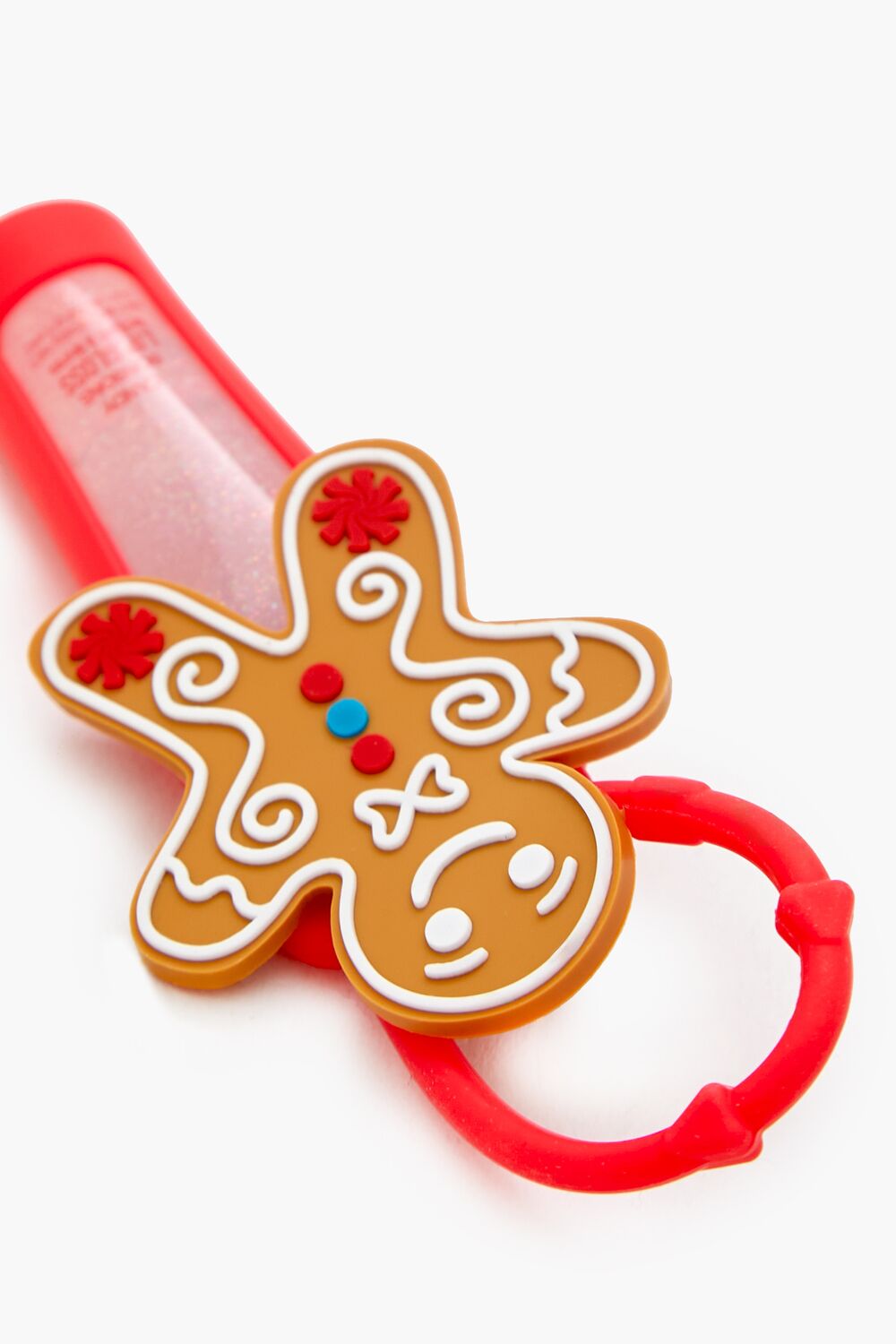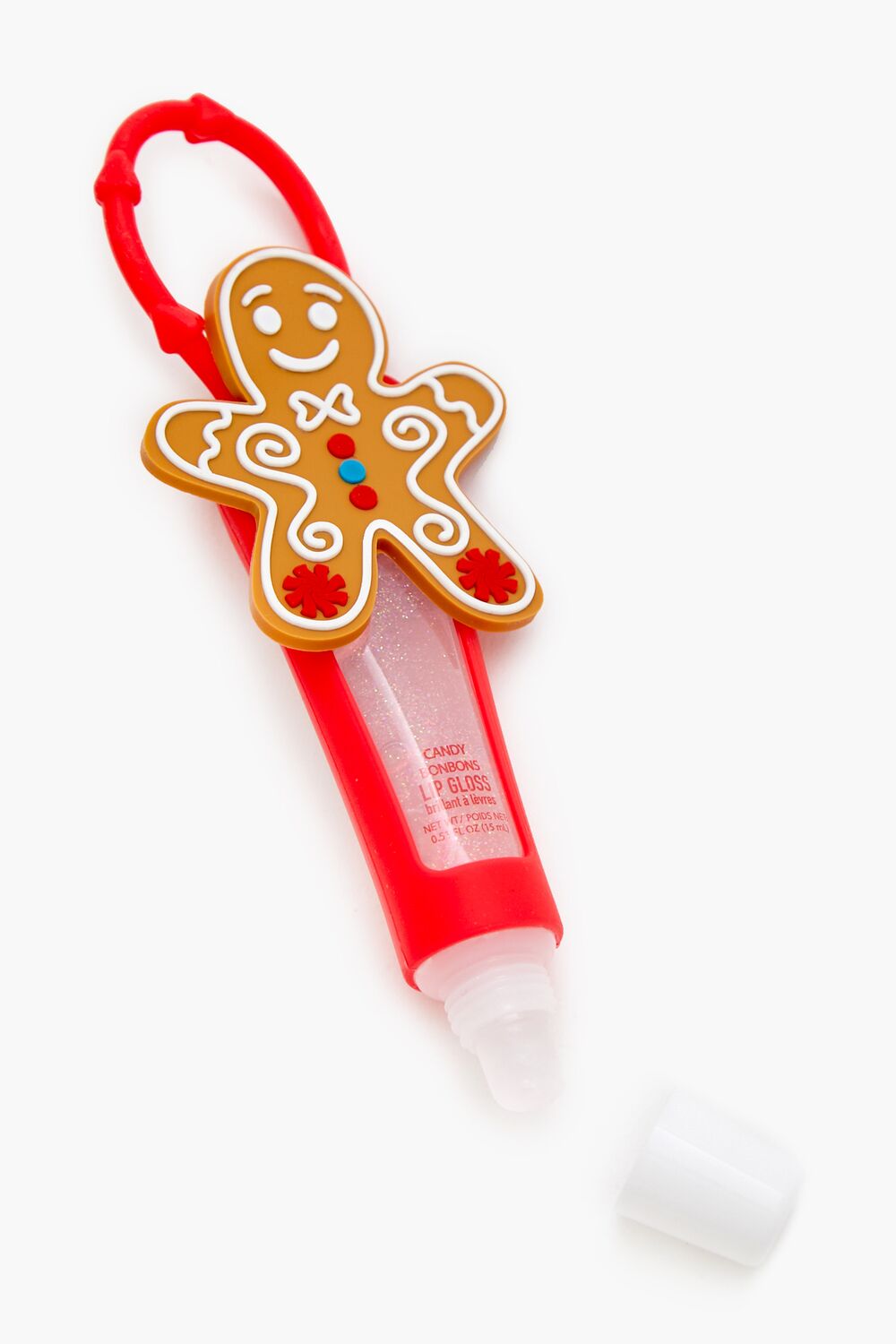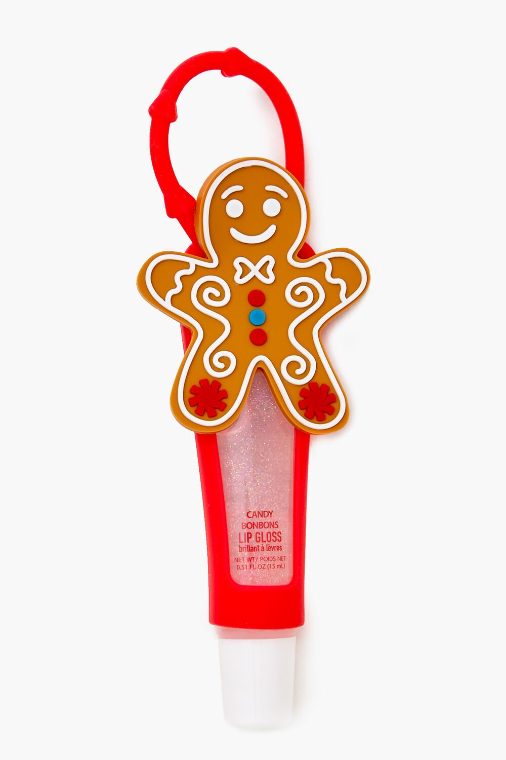 A lip gloss featuring a squeeze tube. candy bonbon flavor. transparent hue. glitter finish. and silicone holder with a gingerbread man applique and loop for hanging.