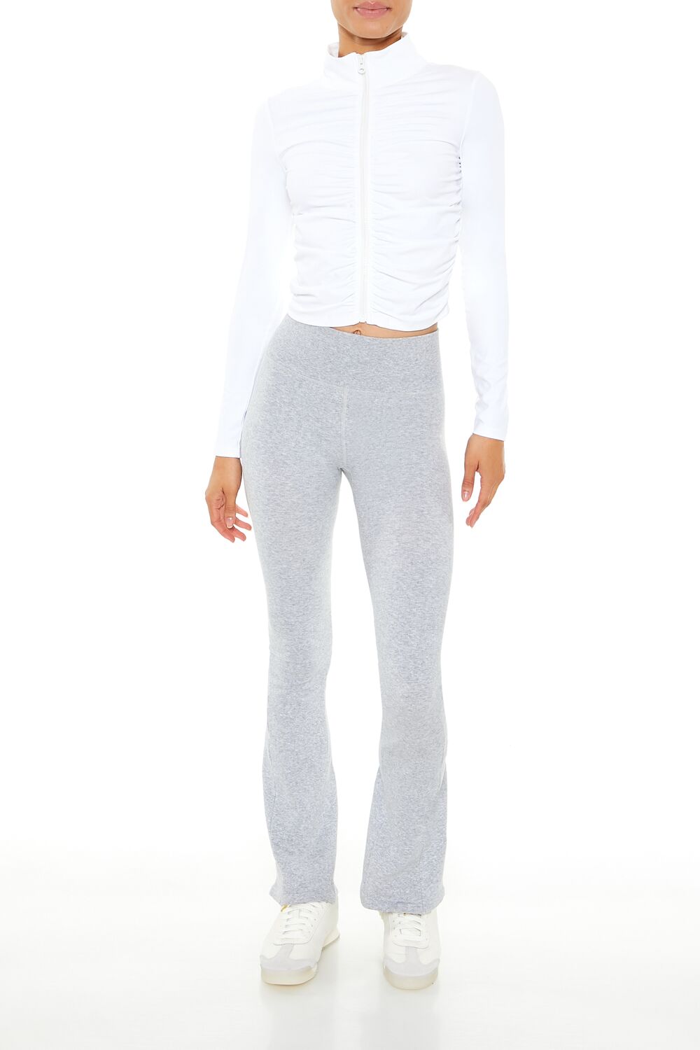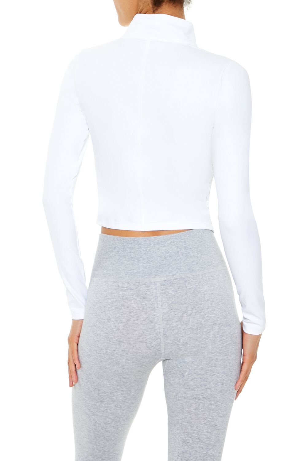 An athletic knit jacket featuring a funnel neck. front ruched design and zip-up closure. long sleeves. cropped hem. fit that sculpts. lifts. and smooths. breathable and moisture wicking fabric. and seams that lay flat for ultimate comfort.