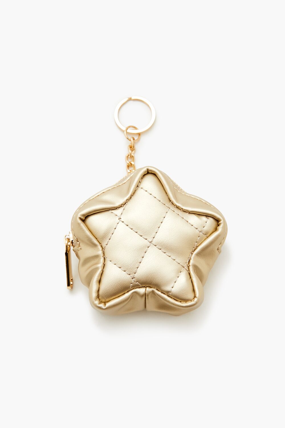 A faux leather coin purse featuring a metallic finish. star shape. quilted construction. zipper top closure. and high-polish keyring.