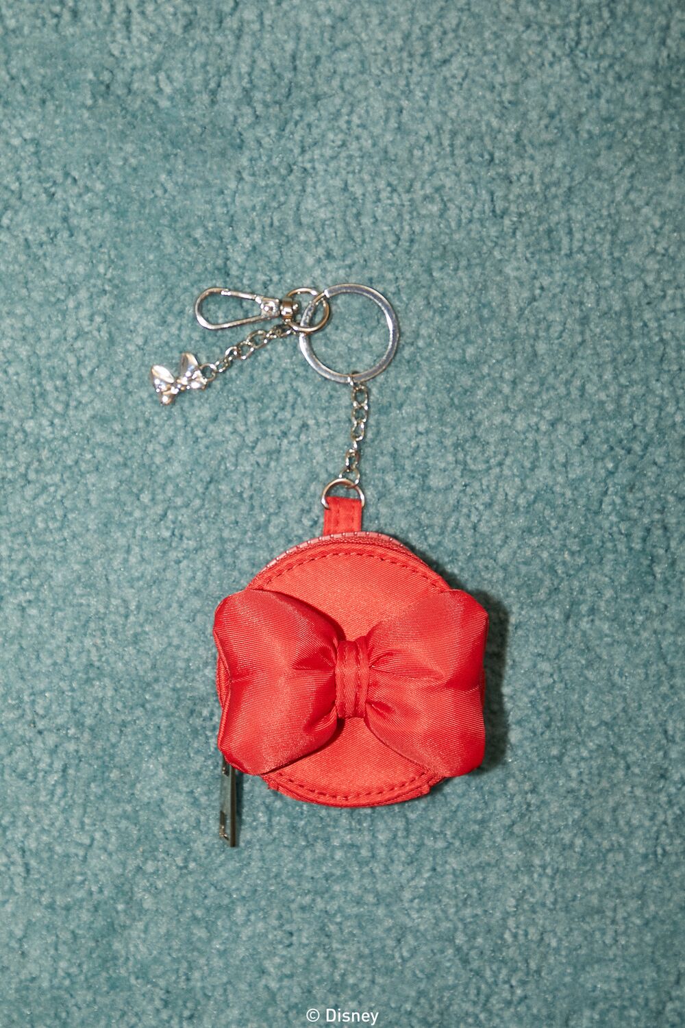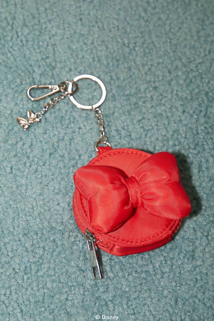From our Disney x Feelings Star collection. this woven coin purse keychain features high-polish hardware. keyring and carabiner attachment. Minnie Mouse bow charm and embellishments. and a zipper closure.