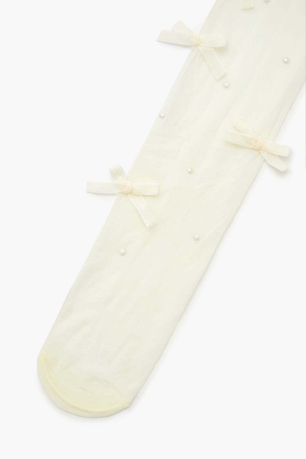 A pair of semi-sheer tights featuring faux pearl and bow embellishments.