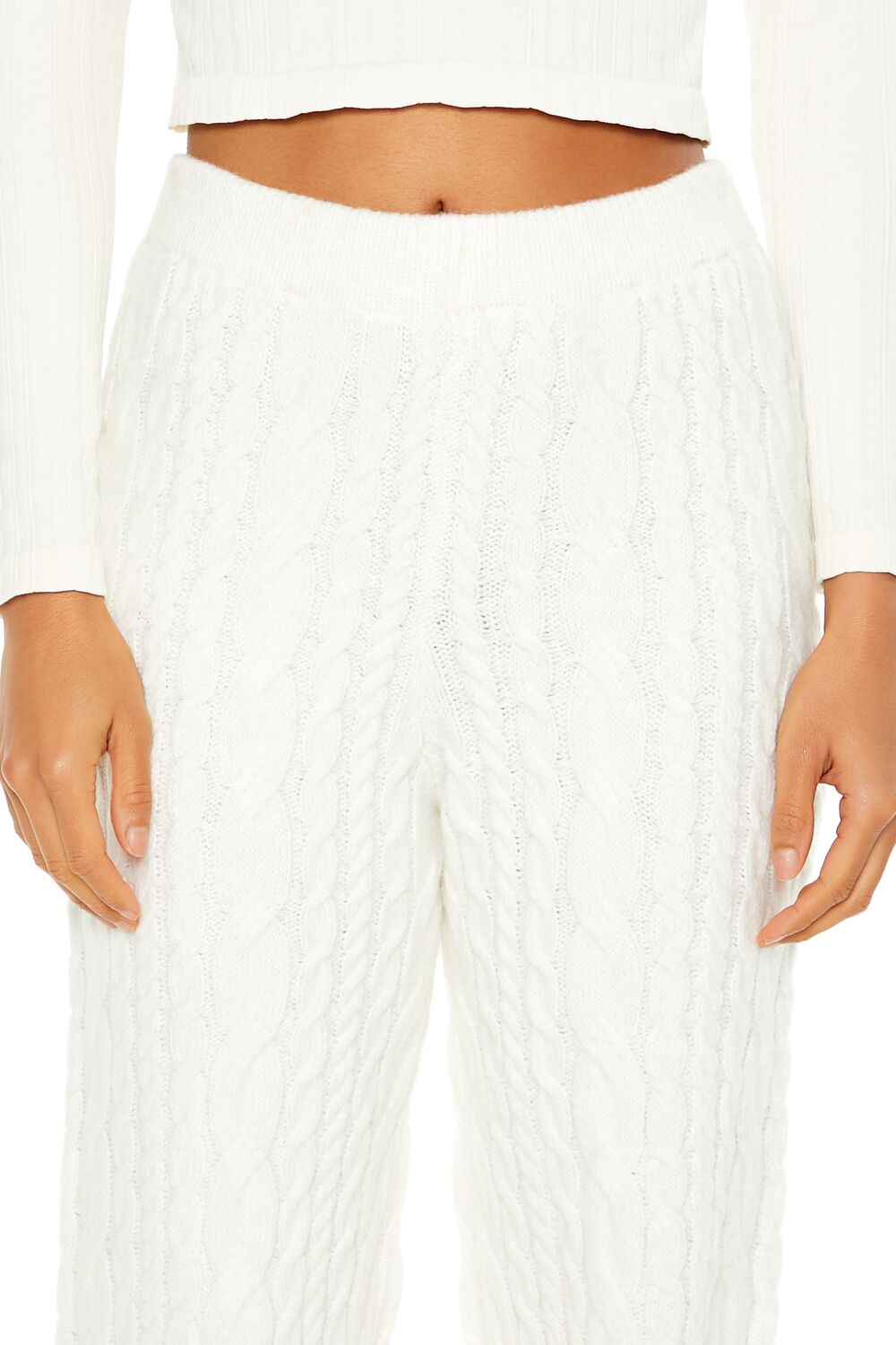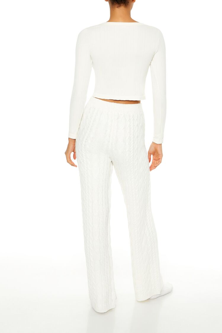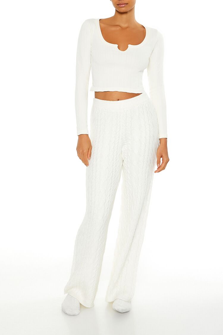 A pair of cable knit pajama pants featuring ribbed trim. a mid-rise waist. and wide leg.