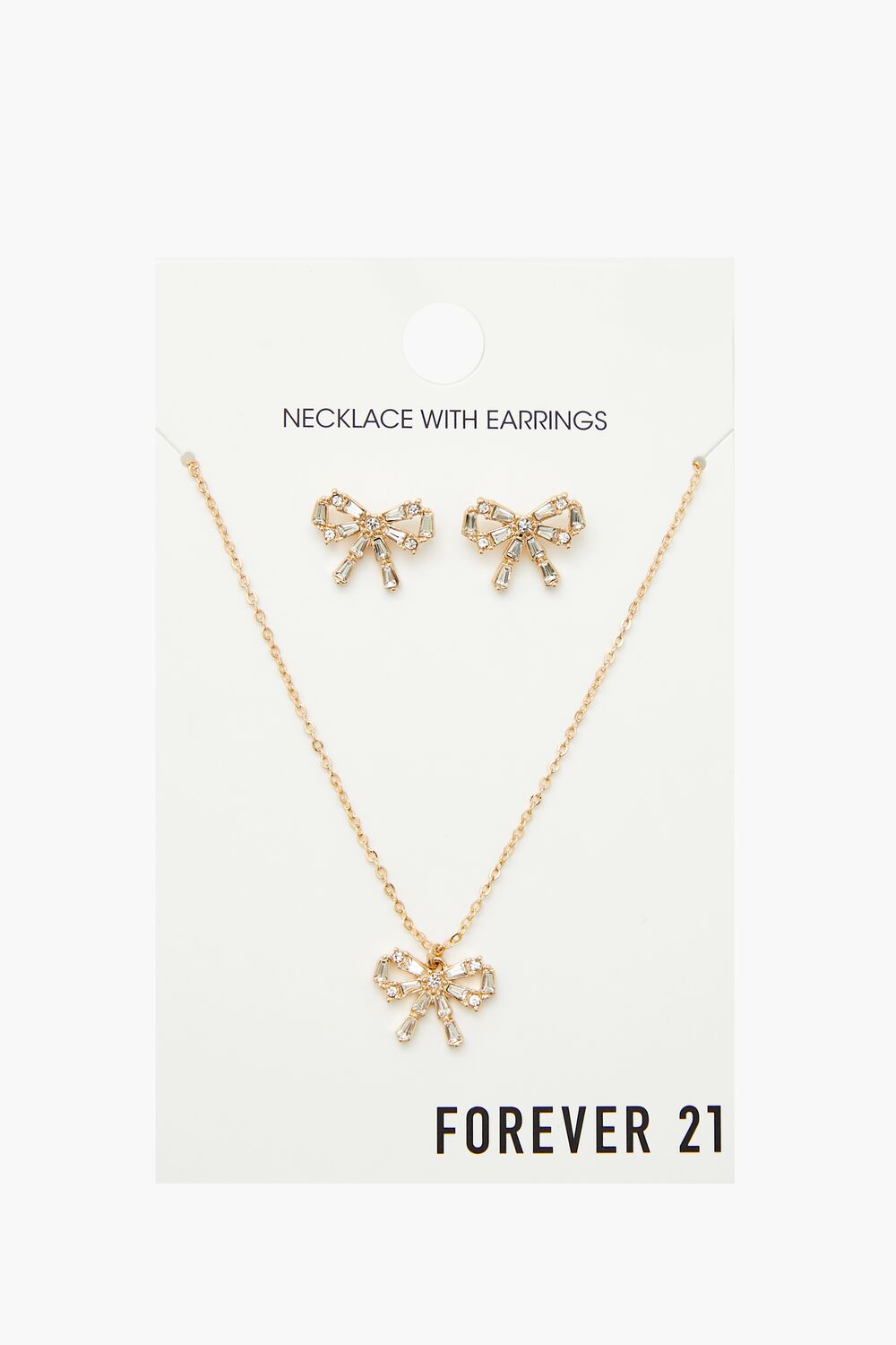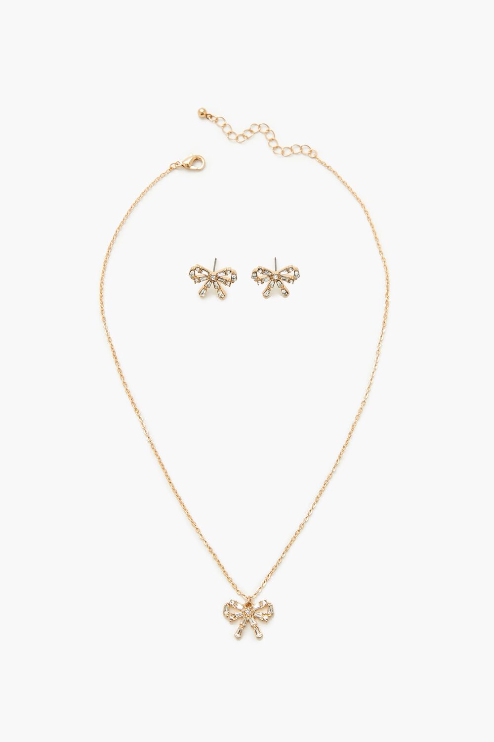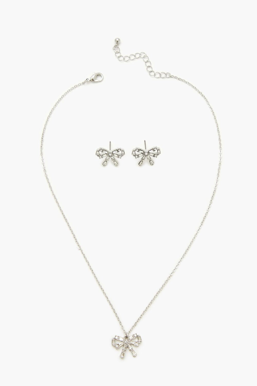 A set of high-polish jewelry featuring a bow design. faux gem embellishments. a pair of stud earrings with post-back closures. and a necklace with a cable chain. pendant. and lobster-clasp closure.