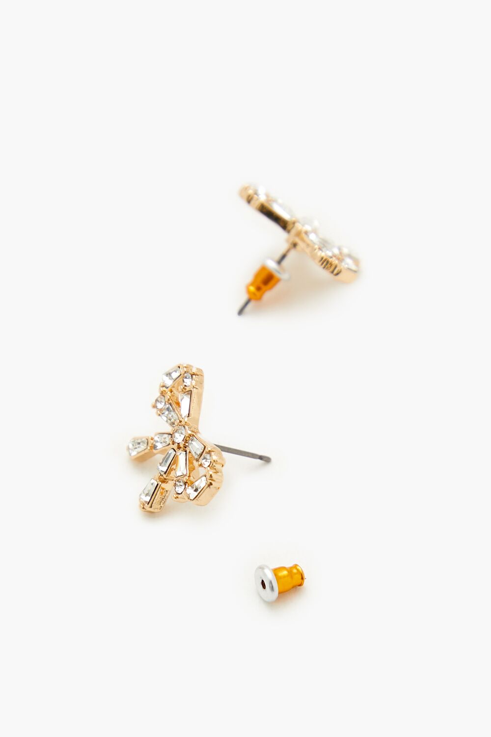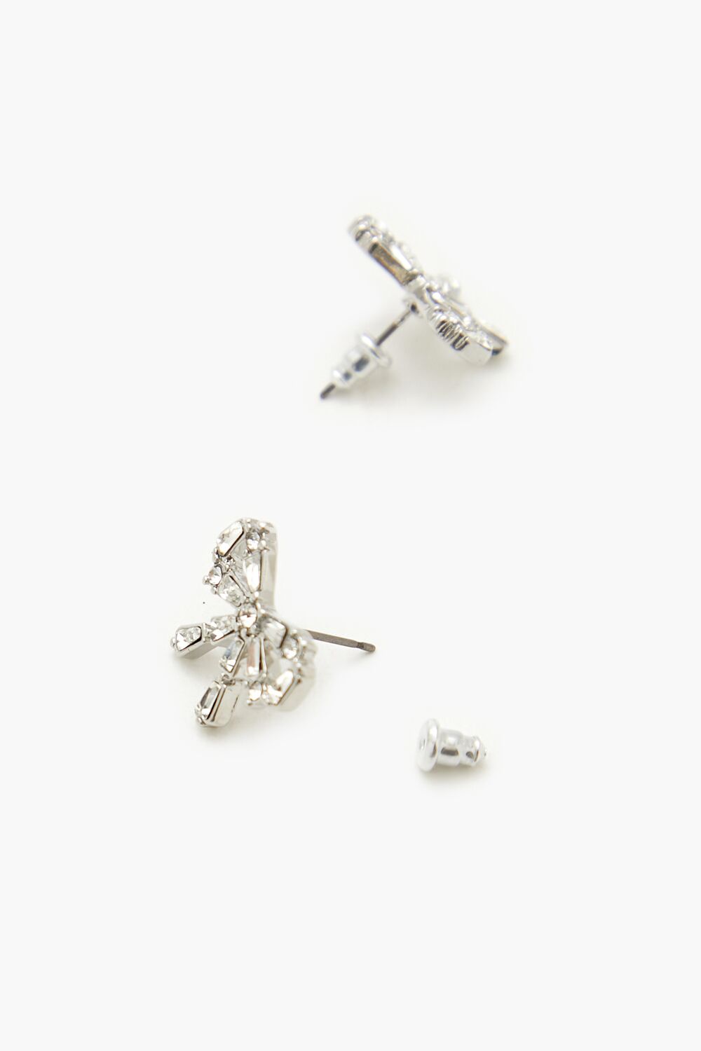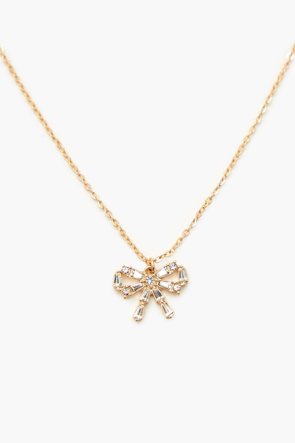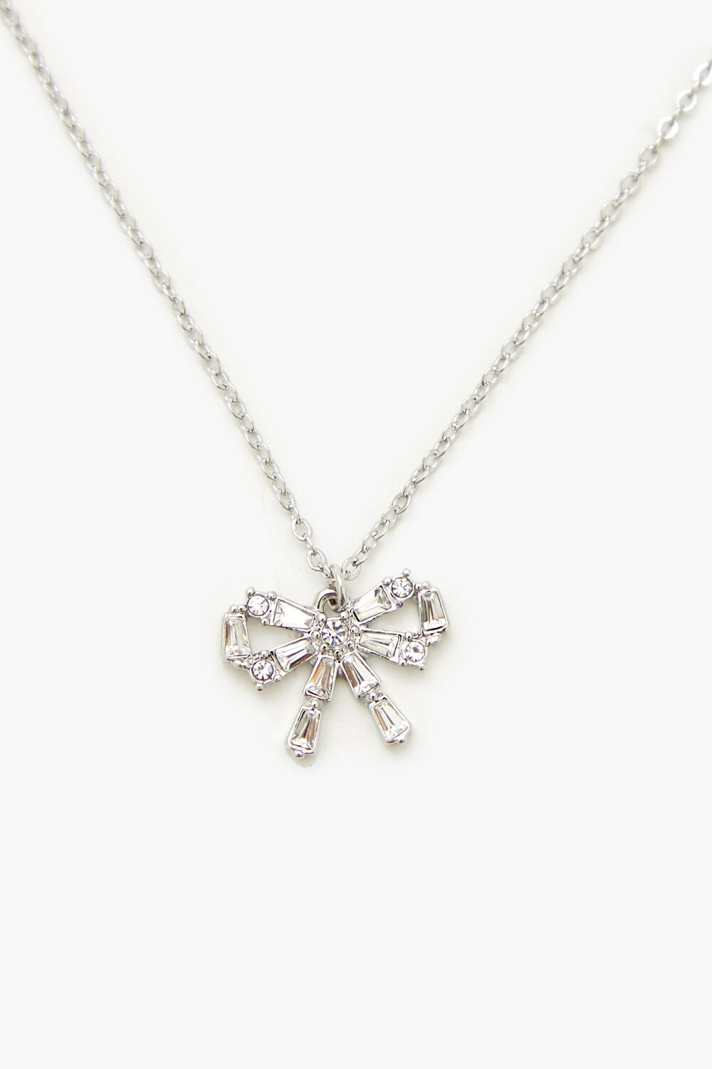 A set of high-polish jewelry featuring a bow design. faux gem embellishments. a pair of stud earrings with post-back closures. and a necklace with a cable chain. pendant. and lobster-clasp closure.