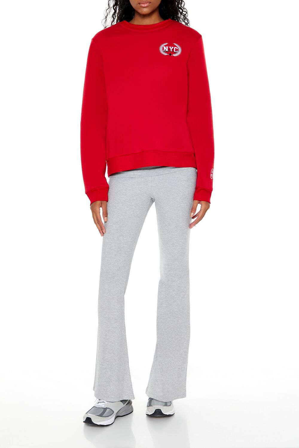 A fleece pullover featuring chest 'NYC' text. long sleeves. a crew neck. ribbed trim. and back 'Brooklyn' and '95' text.