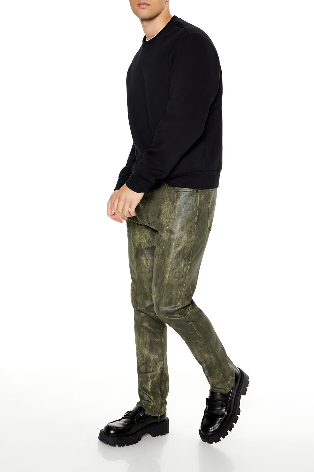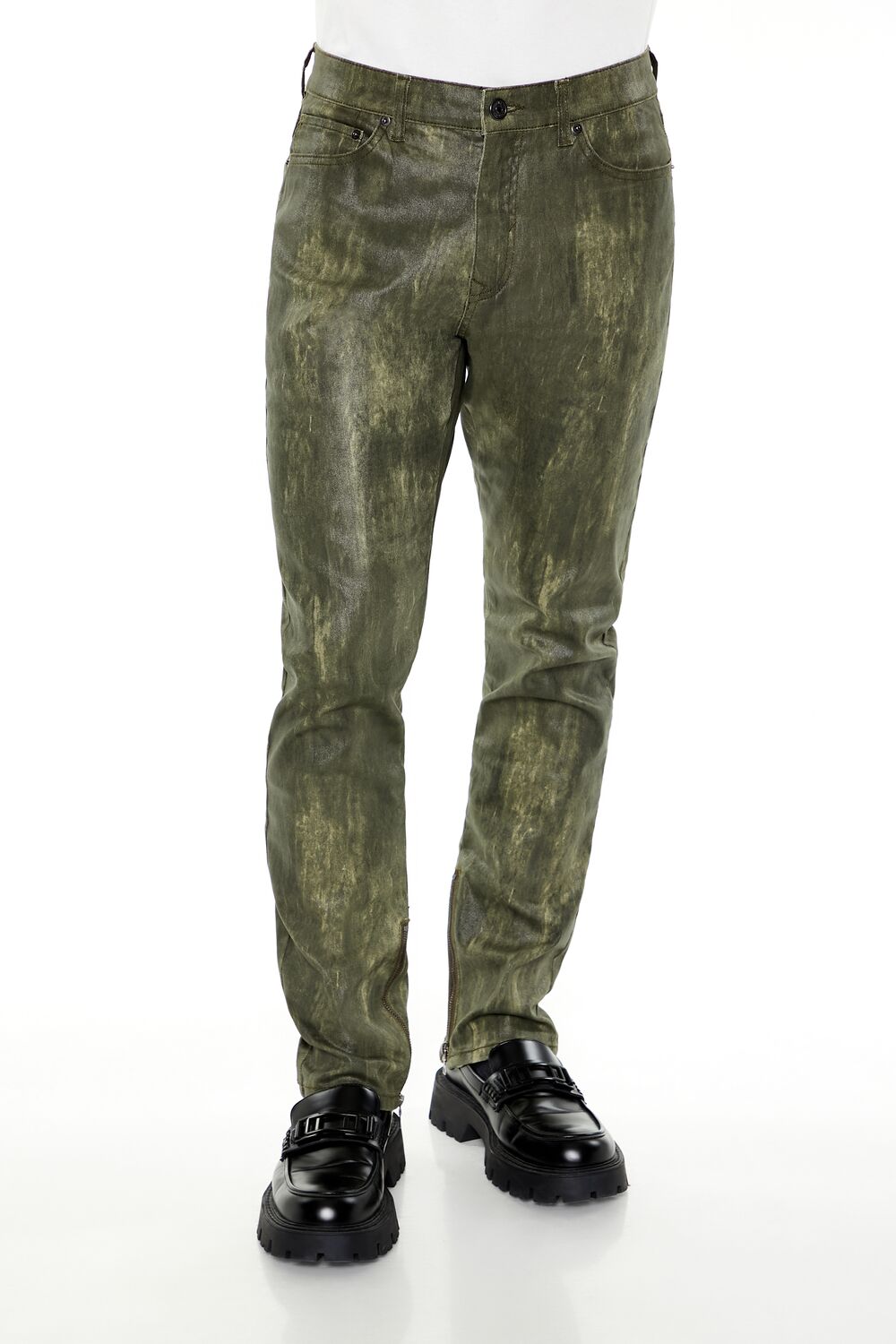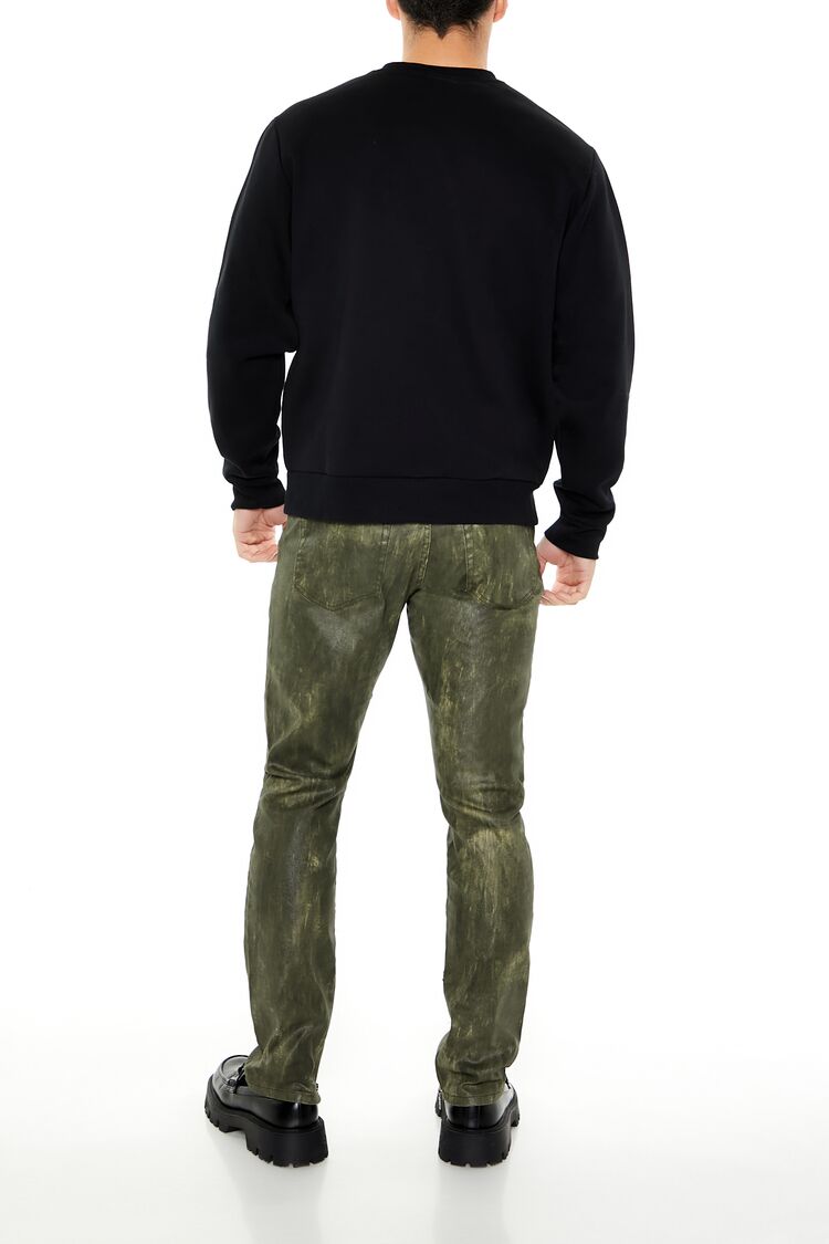 Crafted from stretch-denim. this pair of slim-fit jeans features an allover coated finish. brushstroke effect. mid-rise waist. belt loops. zip fly and button-front closure. and five-pocket construction.