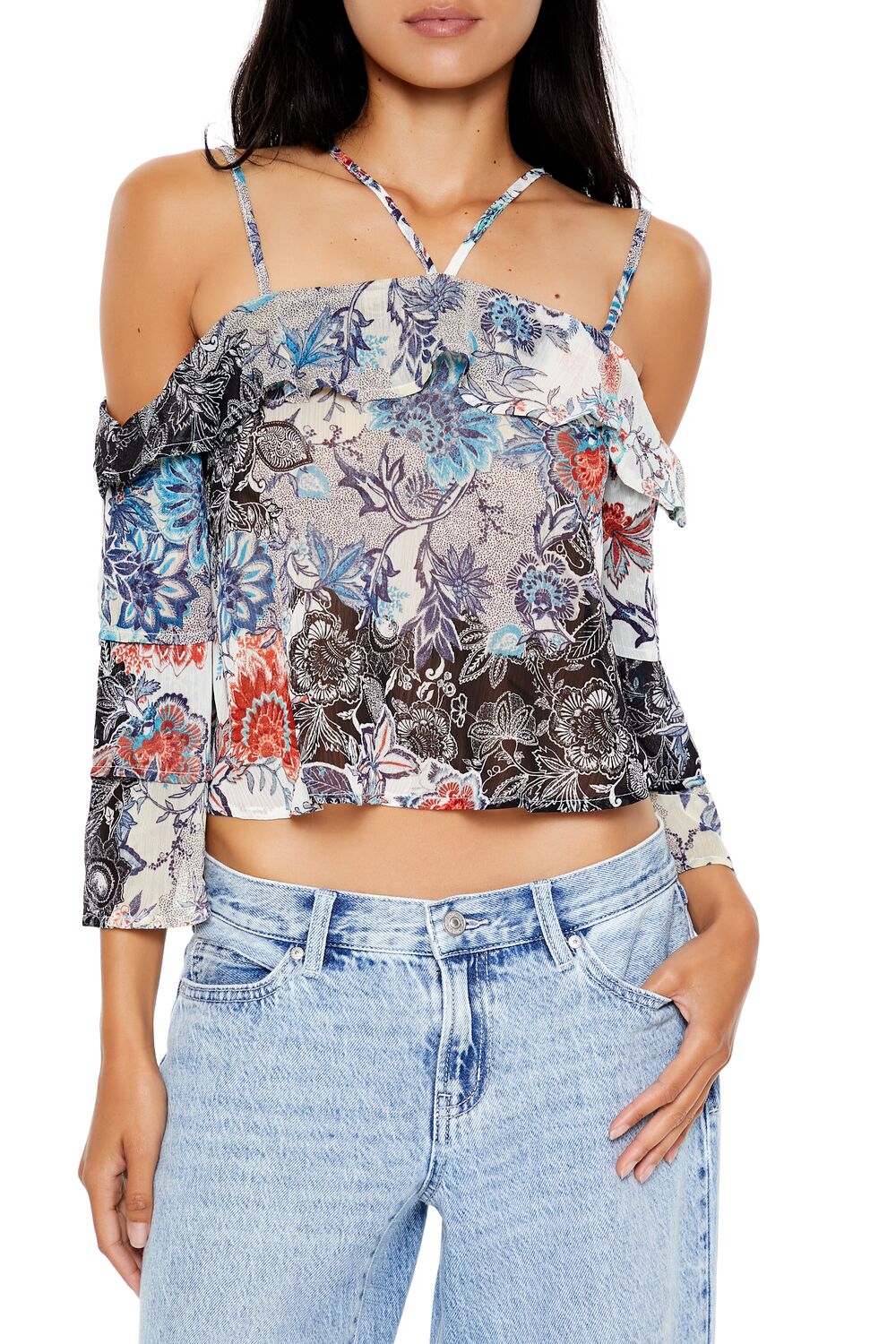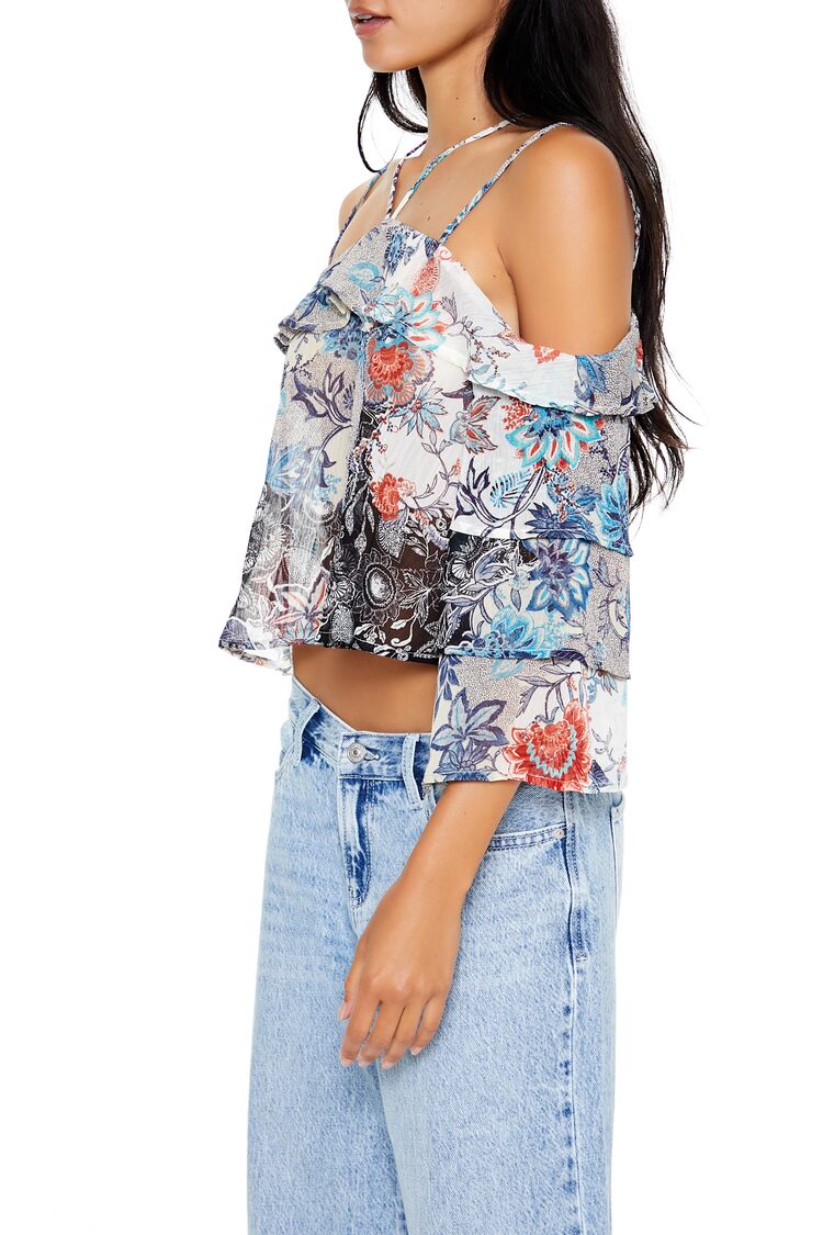 A chiffon top featuring an allover ornate floral print. tiered long sleeves. open shoulders. V-strap neckline. dual cami strap construction. and a cropped hem.