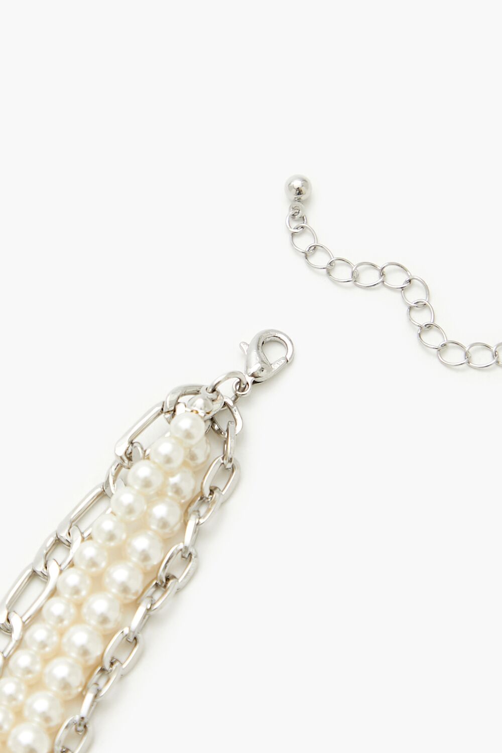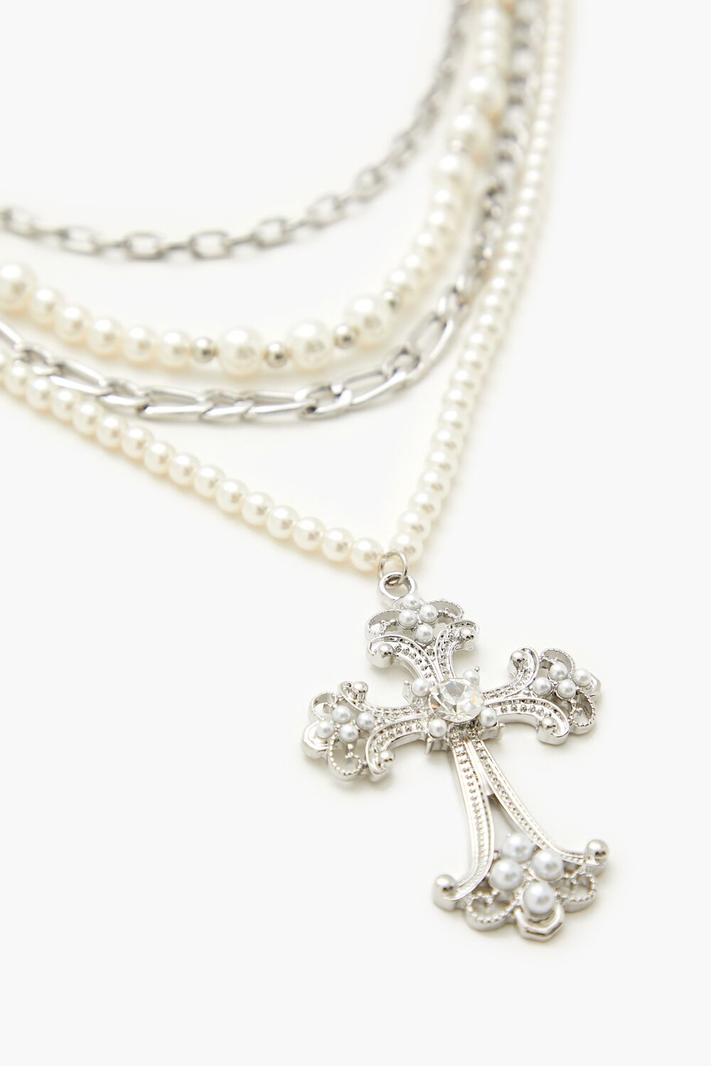 A high-polish layered necklace featuring anchor and Figaro chains. rhinestone. high-polish. and faux pearl bead embellishments. a cross pendant with an etched design. and lobster-clasp closure.