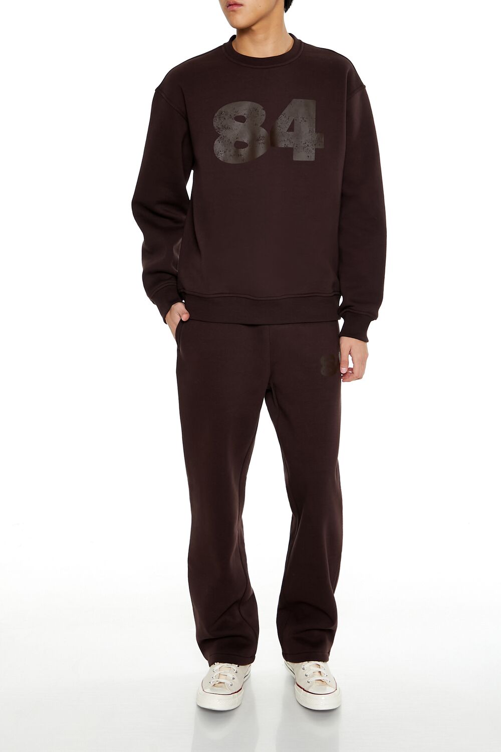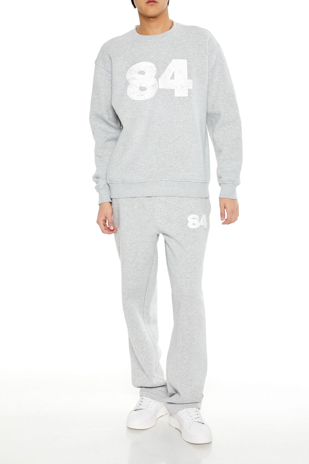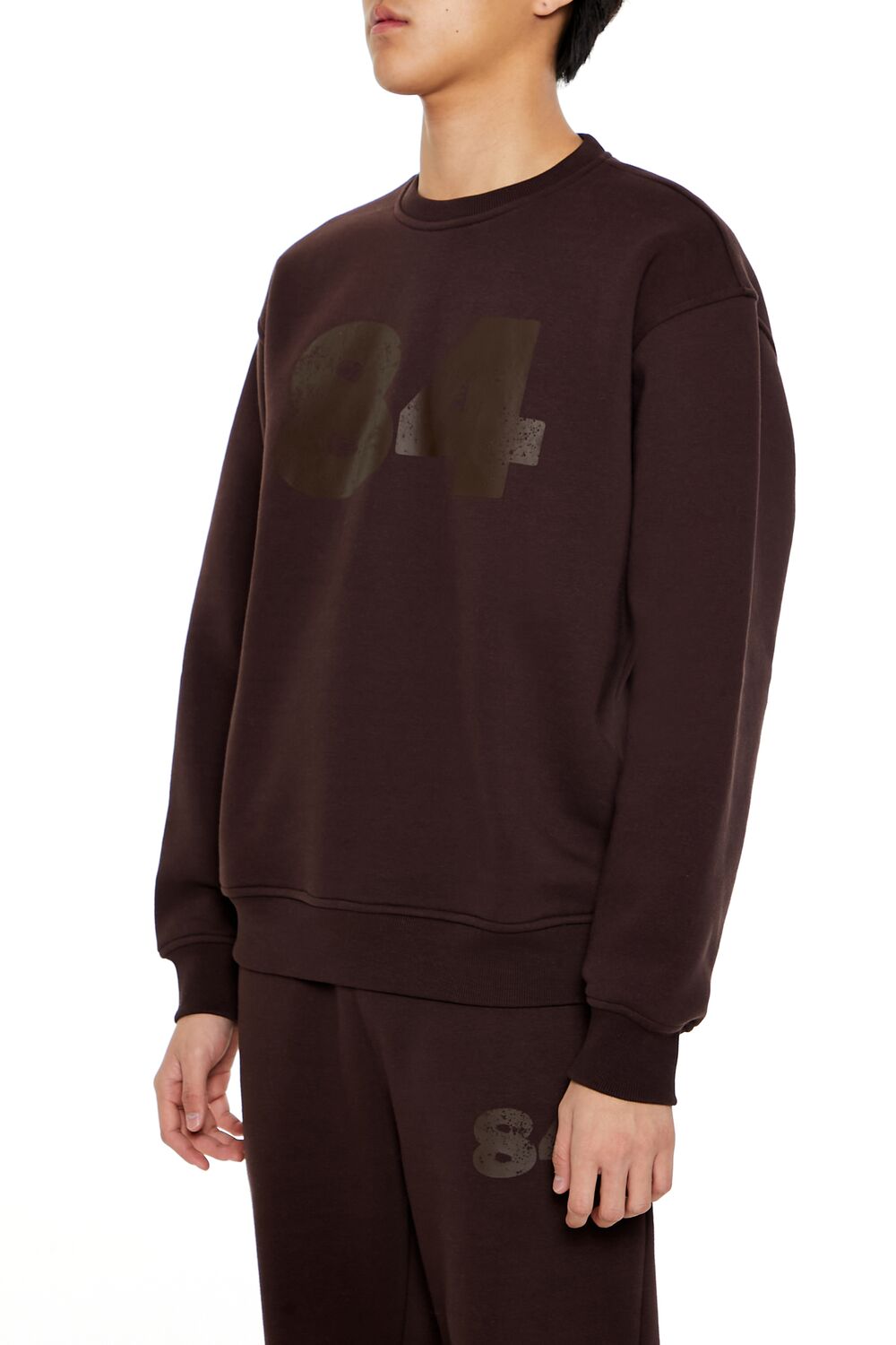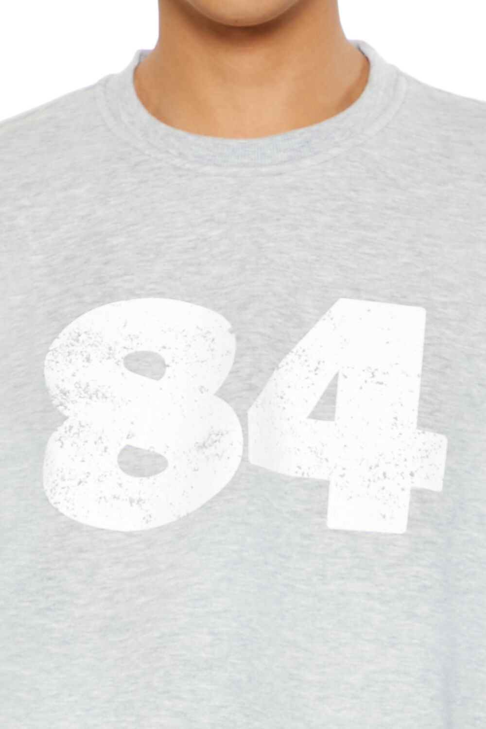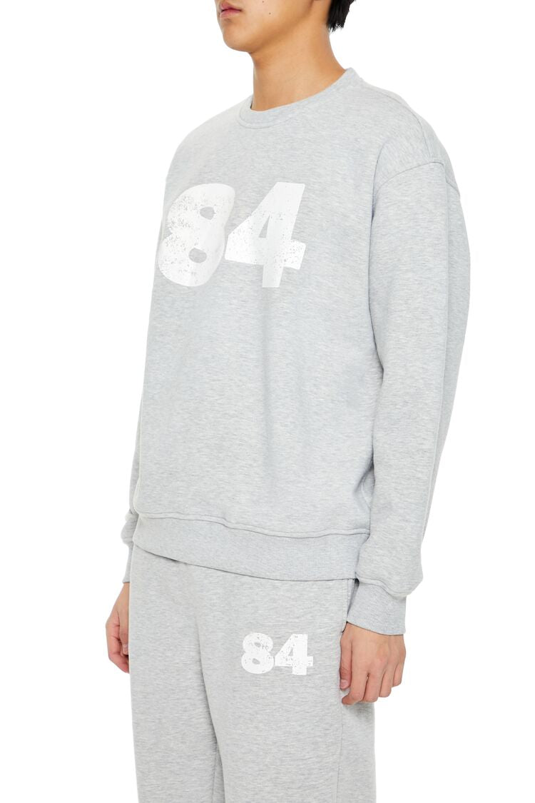 A knit pullover featuring ribbed trim. a crew neck. chest '84' text. and long sleeves.