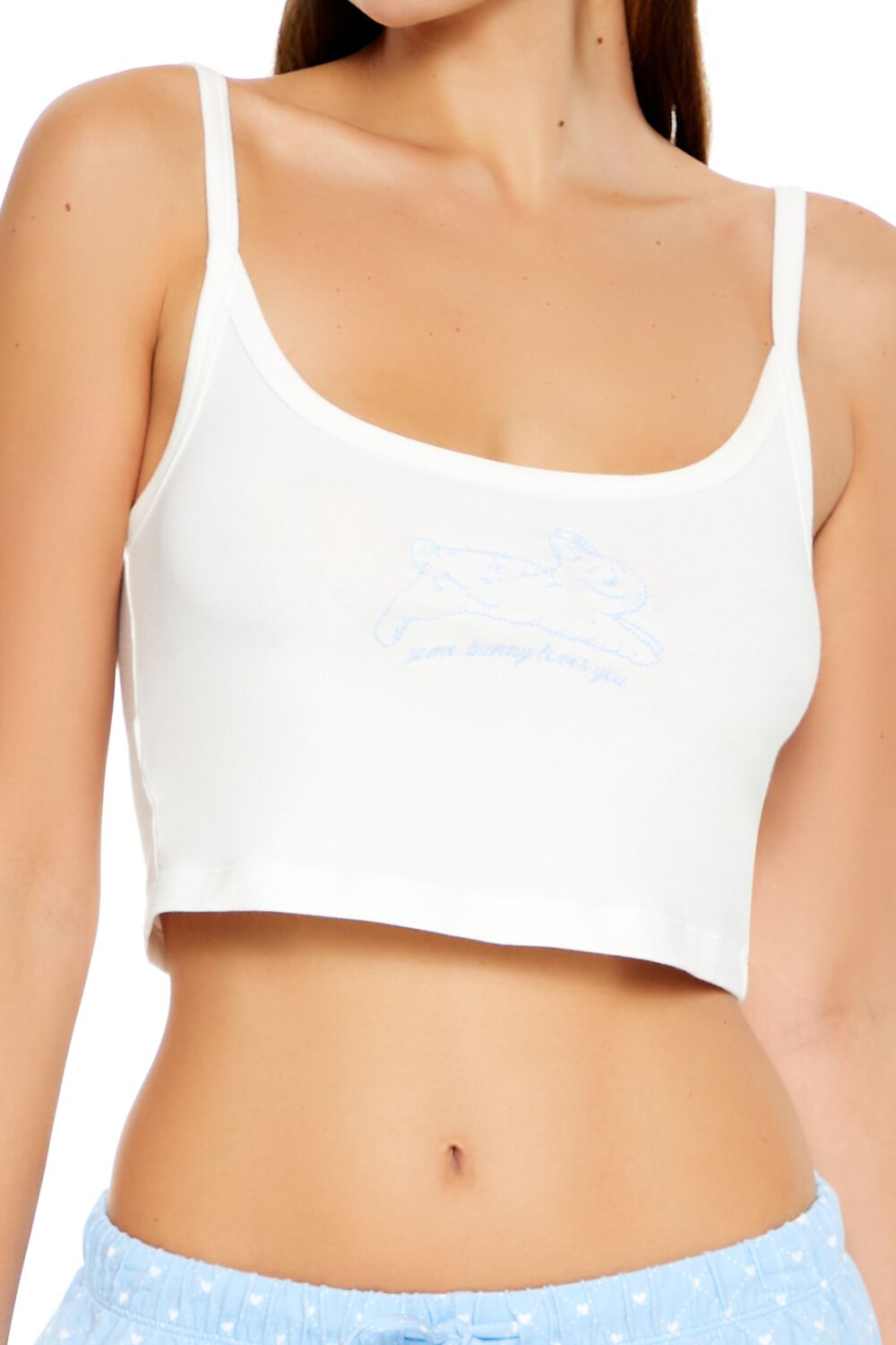 A knit pajama set featuring a cami with a scoop neck and back. embroidered chest 'Some Bunny Loves You' text and bunny graphic. fixed straps. and cropped hem. as well as a matching pair of shorts with an allover lattice and heart pattern and mid-rise drawstring waist.