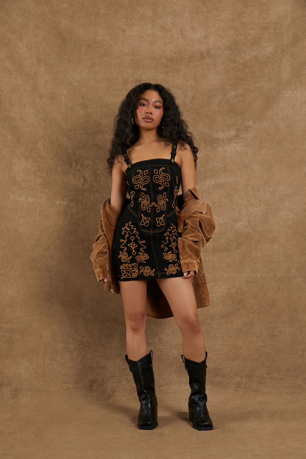 From our Compton Cowboys x Feelings Star collection. this non-stretch denim dress features a mini length. front contrasting ornate embroidery. bodycon silhouette. square-cut neckline and back. adjustable shoulder straps. and an exposed back zipper.