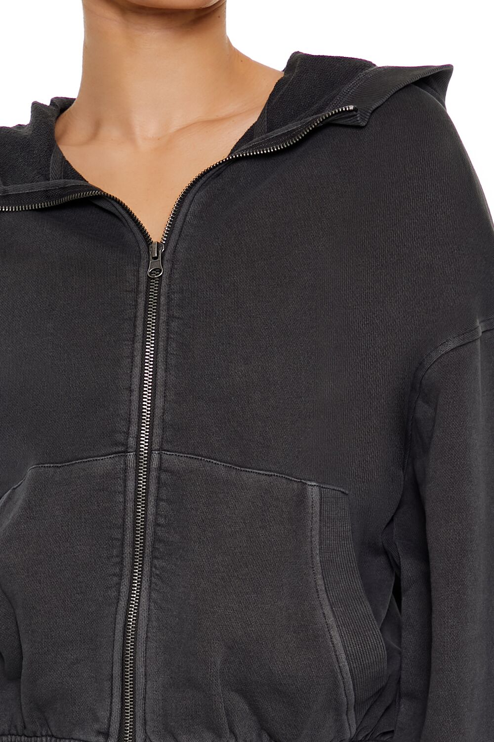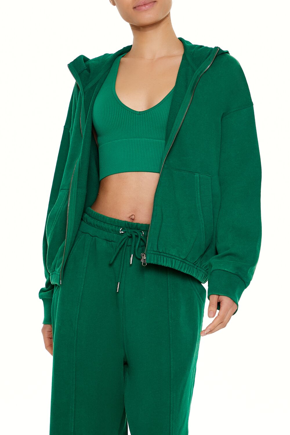 An athletic French terry zip-up hoodie featuring ribbed trim. a split kangaroo front pocket. dropped long sleeves. and elasticized waist.