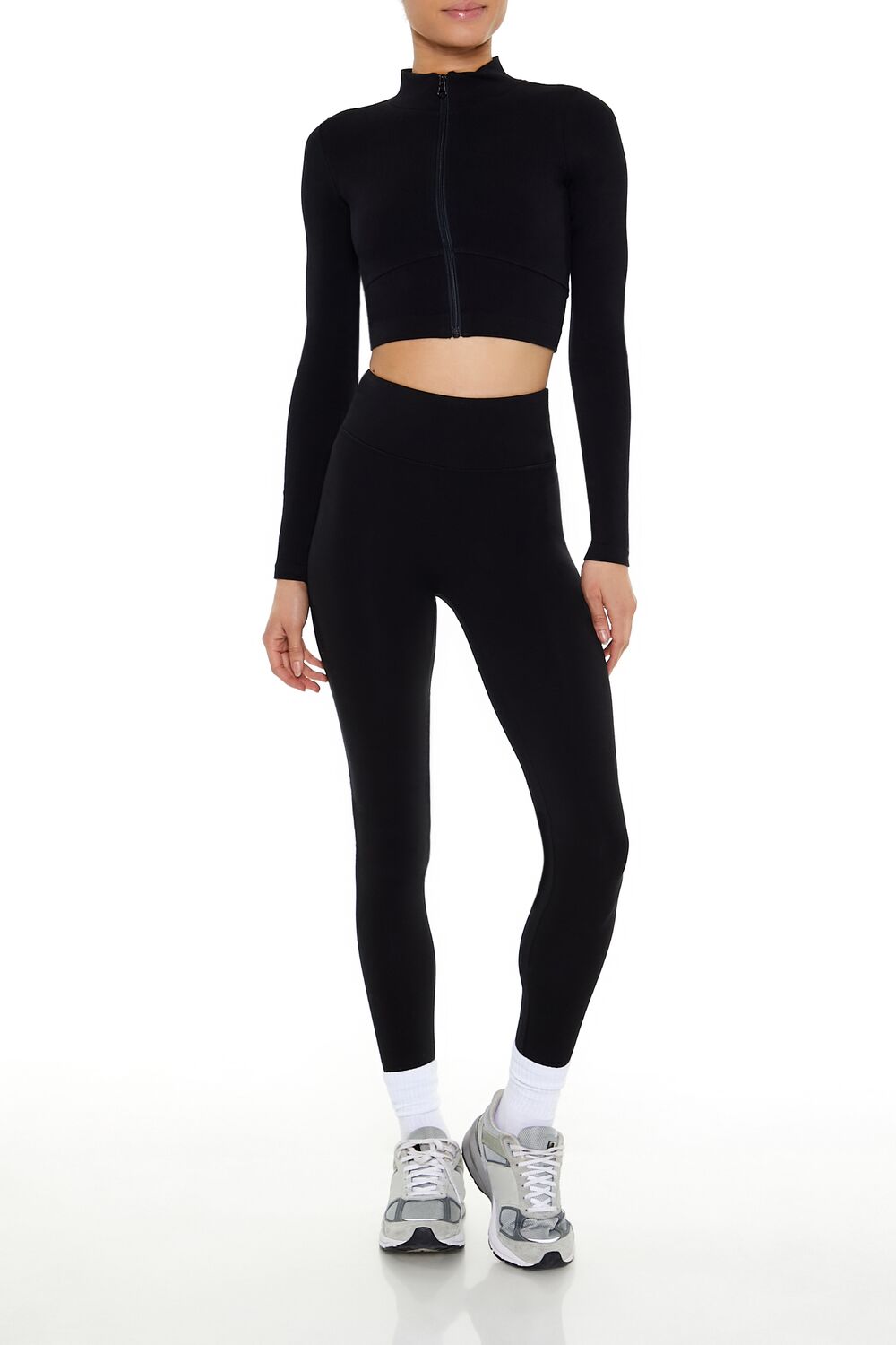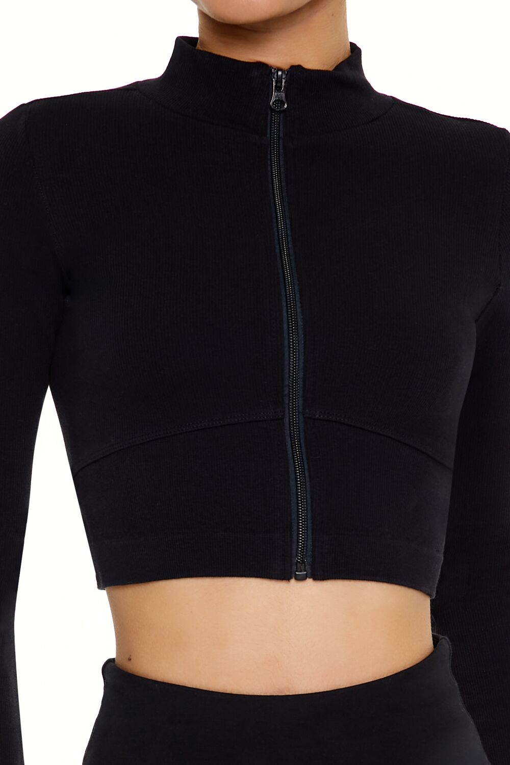 An athletic knit jacket featuring a mock neck. zip-up front closure. cropped hem. seamless fit that sculpts. lifts. and smooths. breathable and moisture wicking fabric. and seams that lay flat for ultimate comfort.
