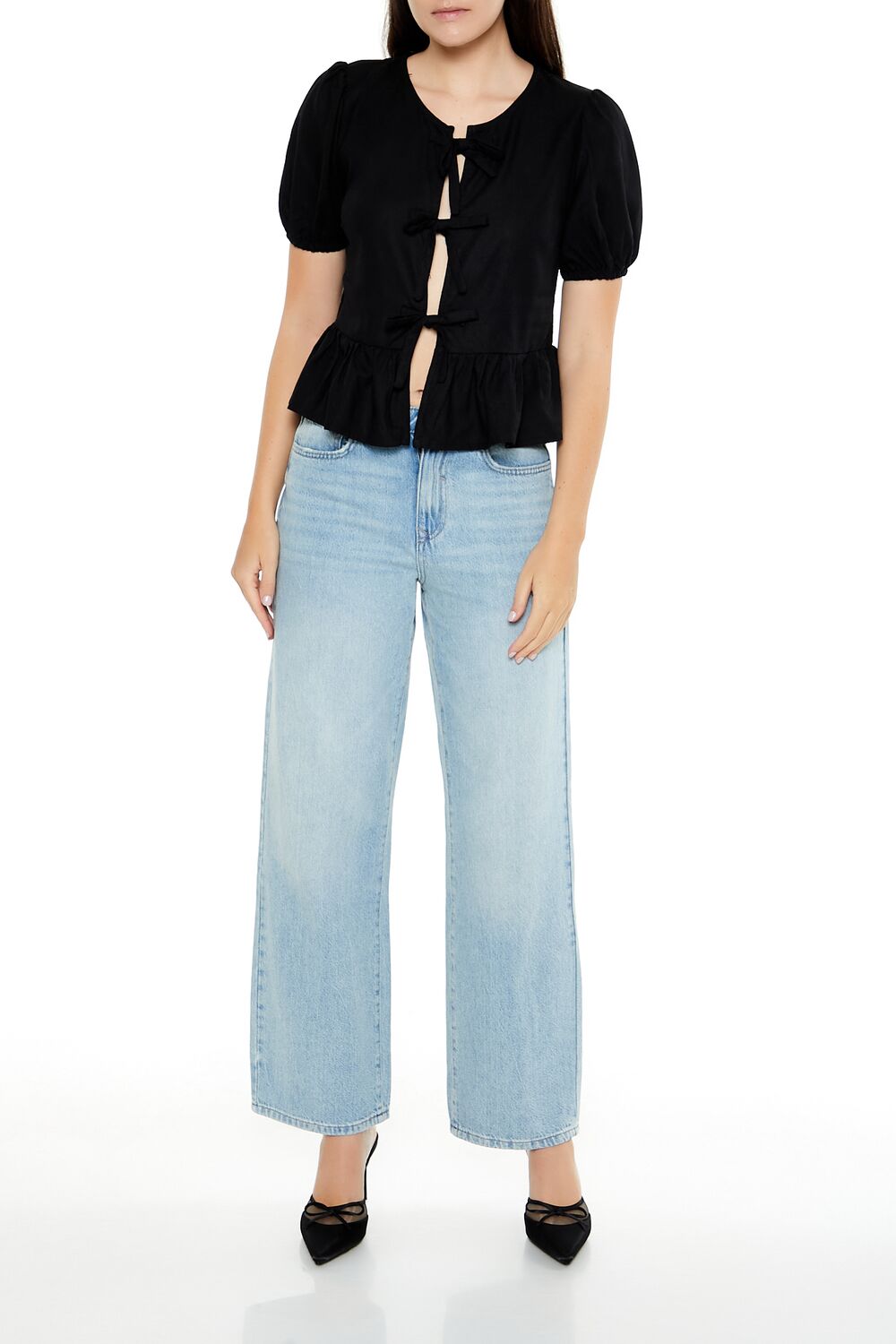 A woven top featuring a round neckline. short puff sleeves. flounce hem. and a split front with self-tie bows.