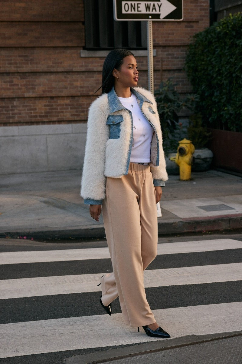 Combo jacket featuring plush faux fur body with contrast denim trim
