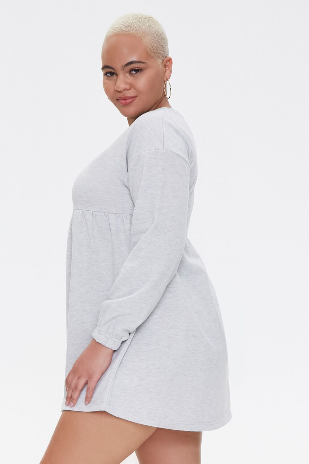 A fleece mini dress featuring dropped long sleeves. elasticized trim. and a crew neck.