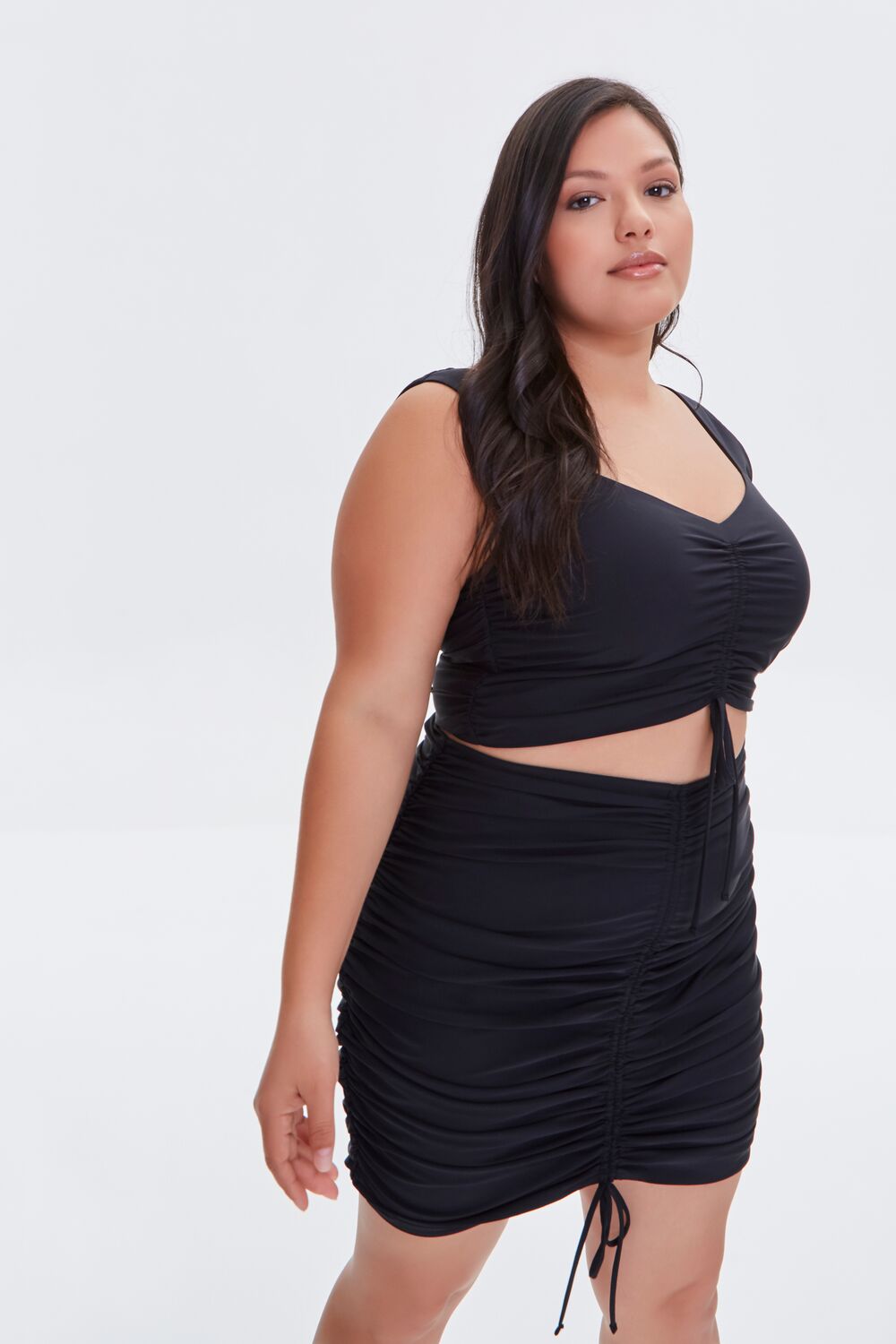 Feelings Star+ - A stretch-knit mini skirt featuring ruched sides with self-tie drawstrings. high-rise waist. and a bodycon silhouette.