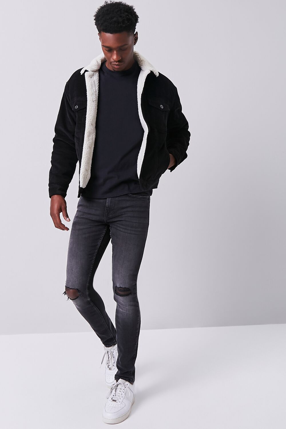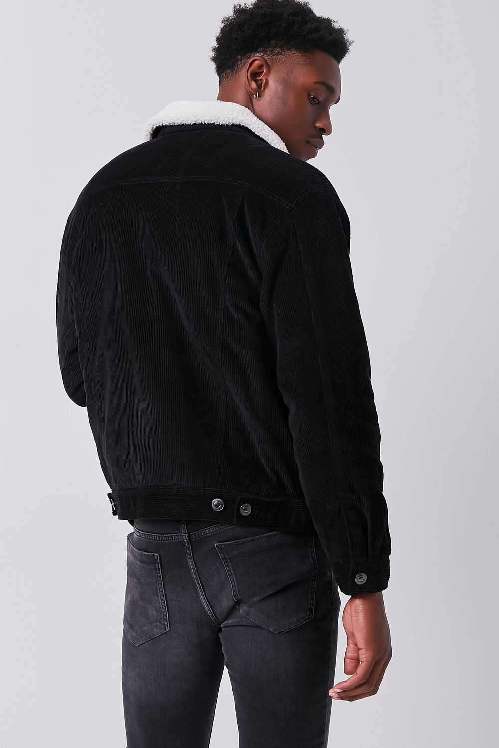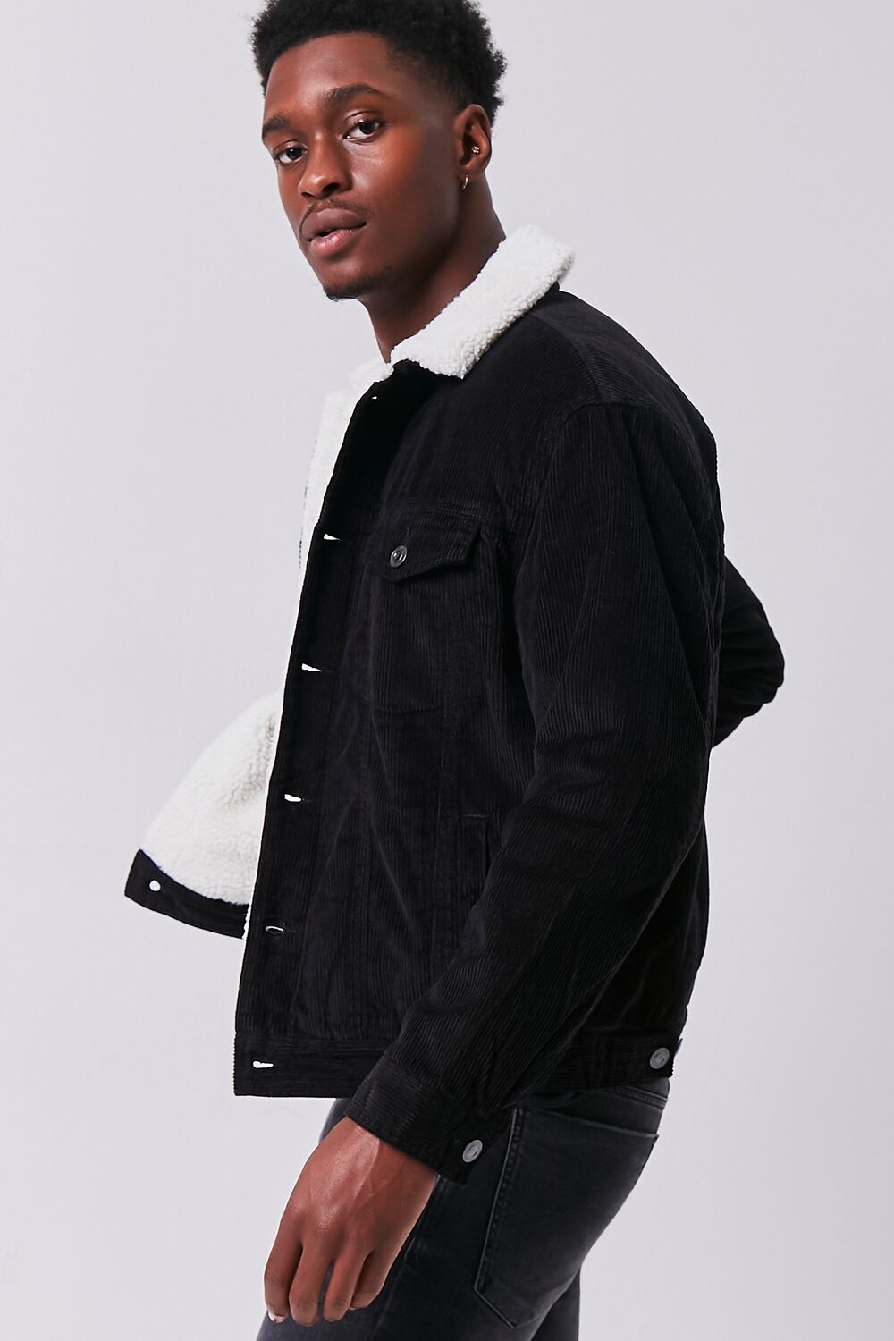 A corduroy jacket featuring faux shearling lining. a basic collar. dropped long sleeves. button closures on the chest flap pockets and front. and slanted front pockets.