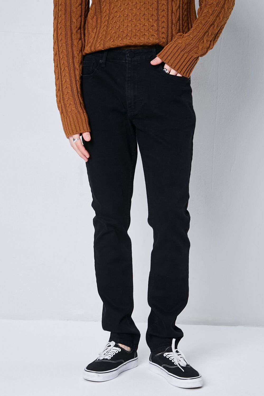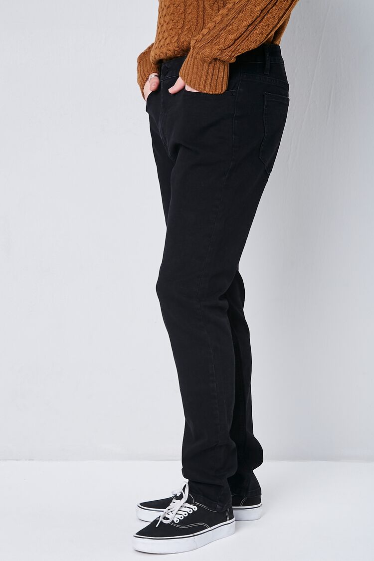 A pair of basic slim-fit jeans featuring belt loops. a zip fly with button closure. and five-pocket construction.