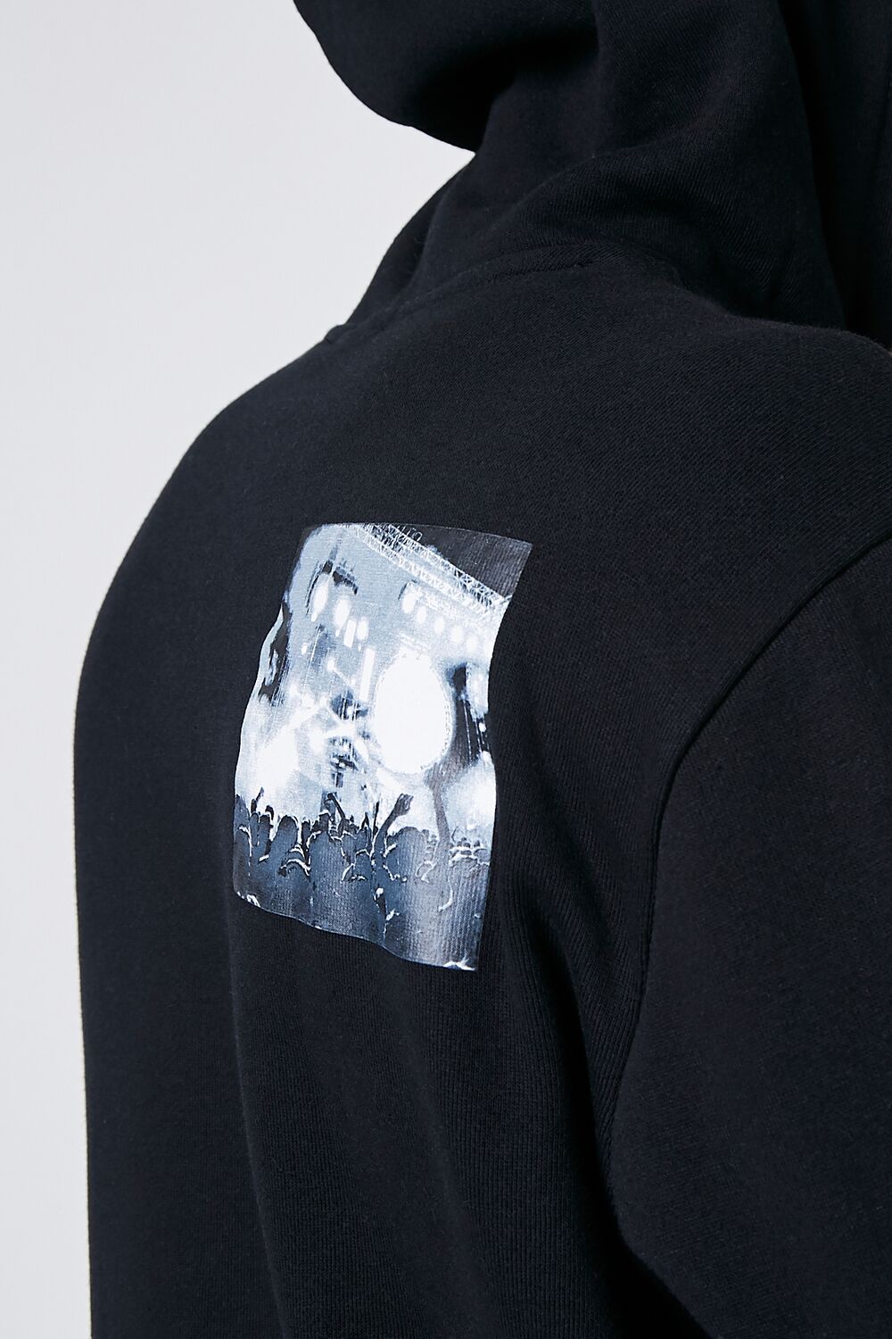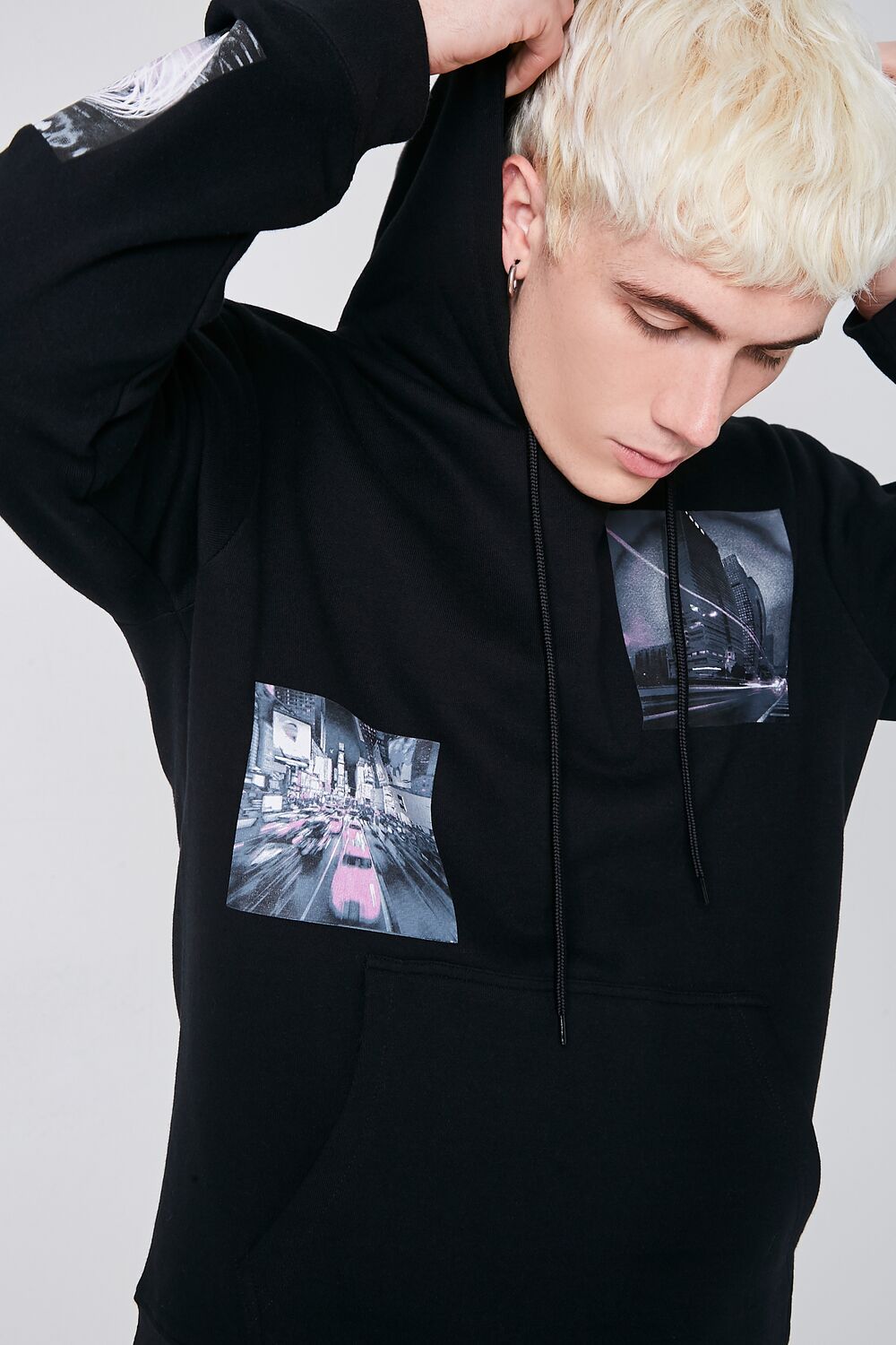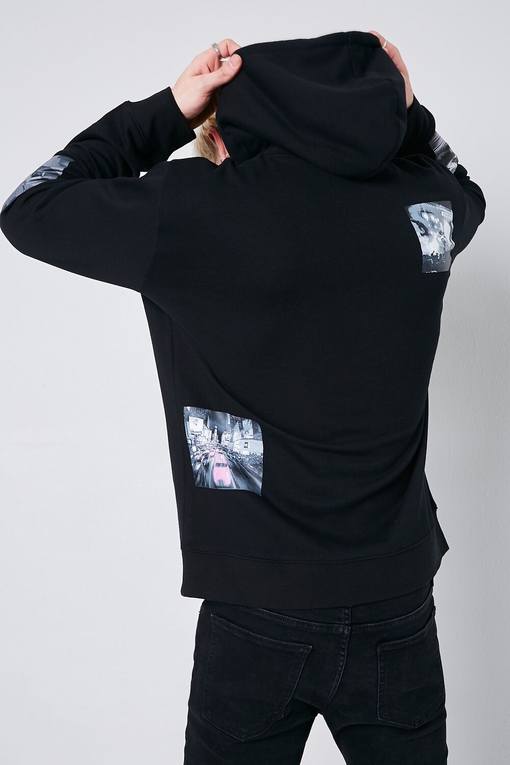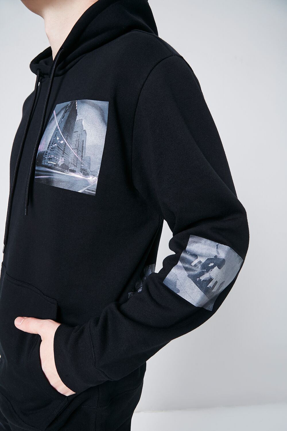 A fleece knit hoodie featuring various cityscape graphics scattered throughout. a drawstring hood. kangaroo pocket. dropped long sleeves. and ribbed trim.