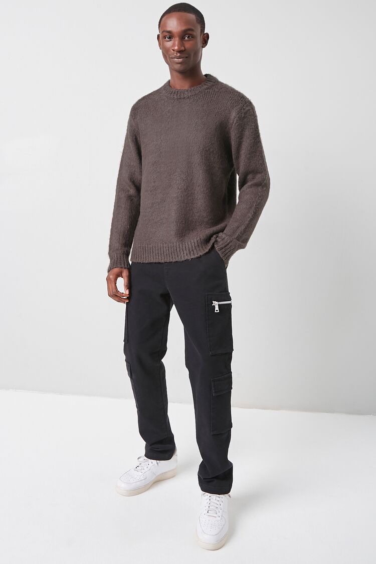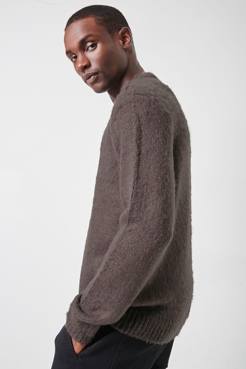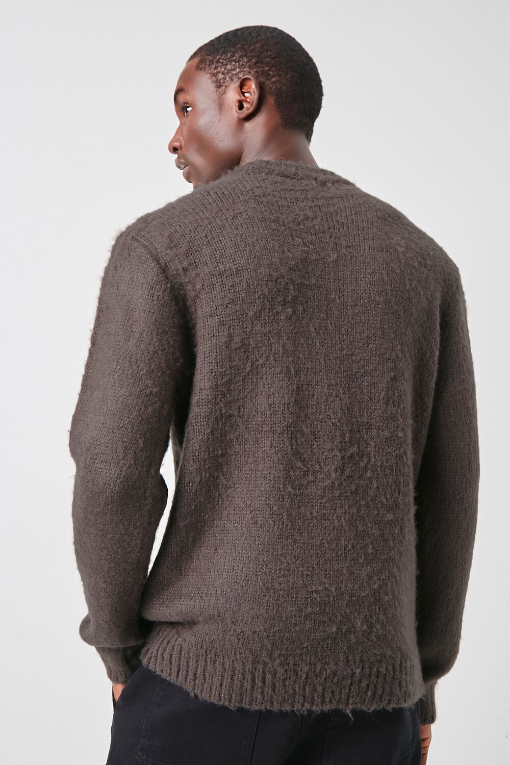 A brushed purl knit sweater featuring a round neckline. long sleeves. and ribbed trim.