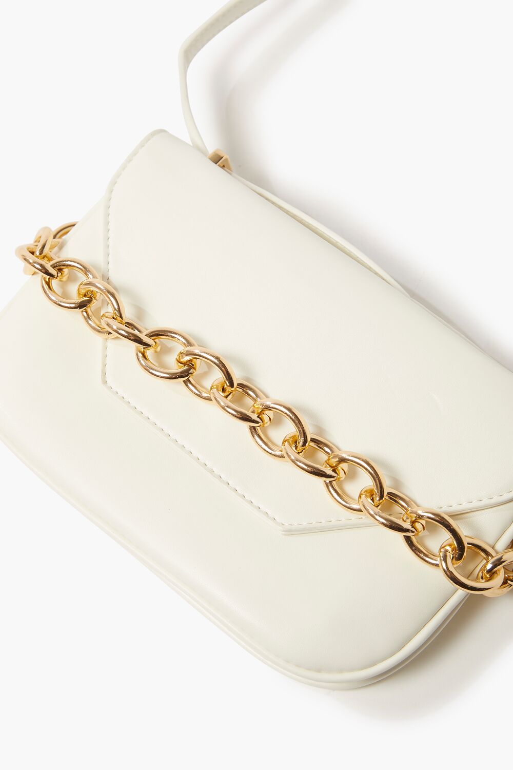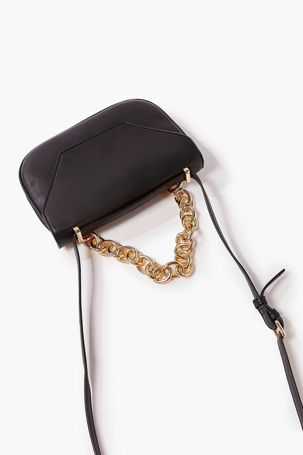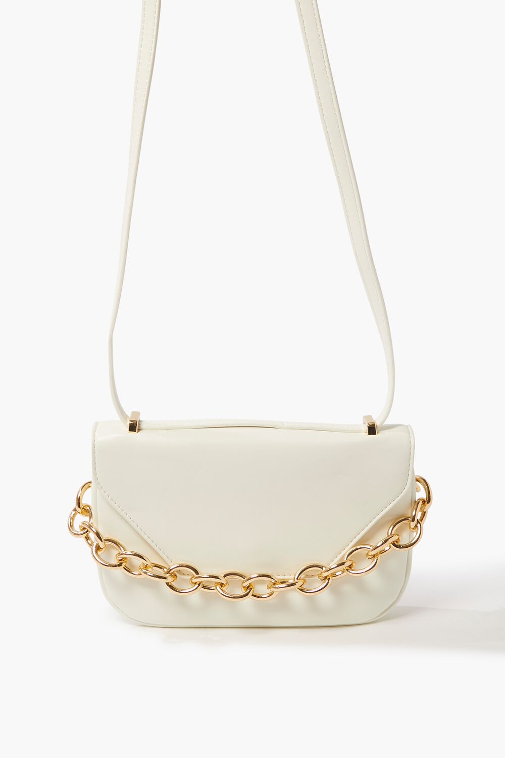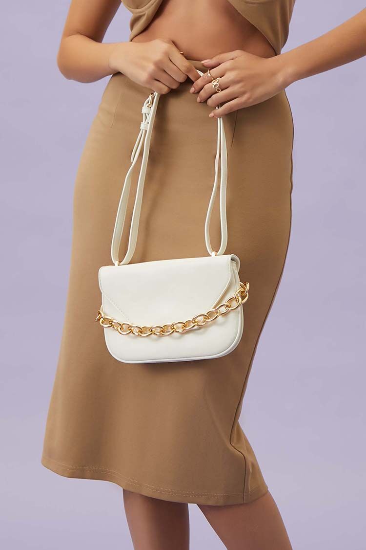 A faux leather crossbody bag featuring high-polish hardware. colorblock design. a curb chain top handle. flap top. adjustable strap. and a structured body.