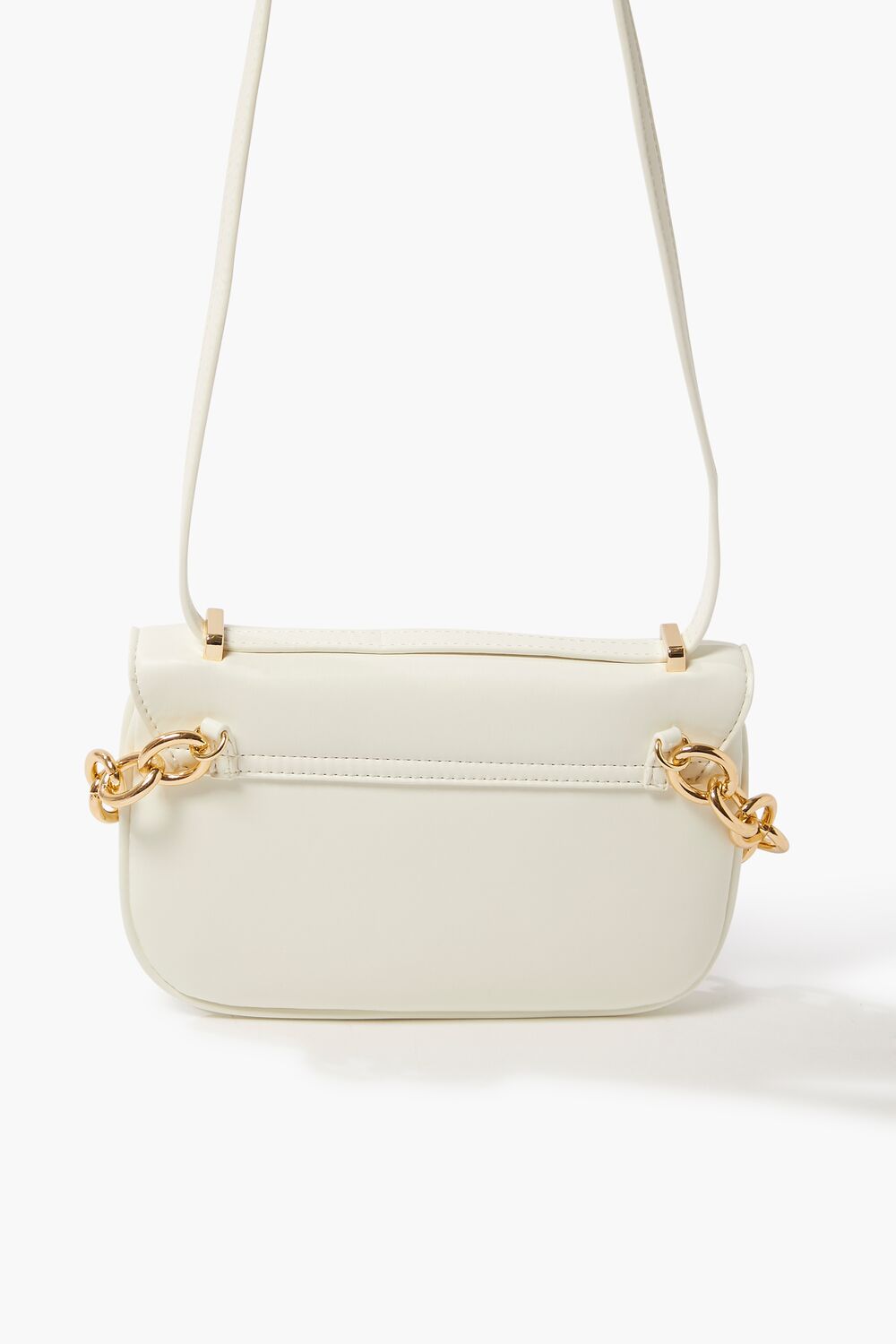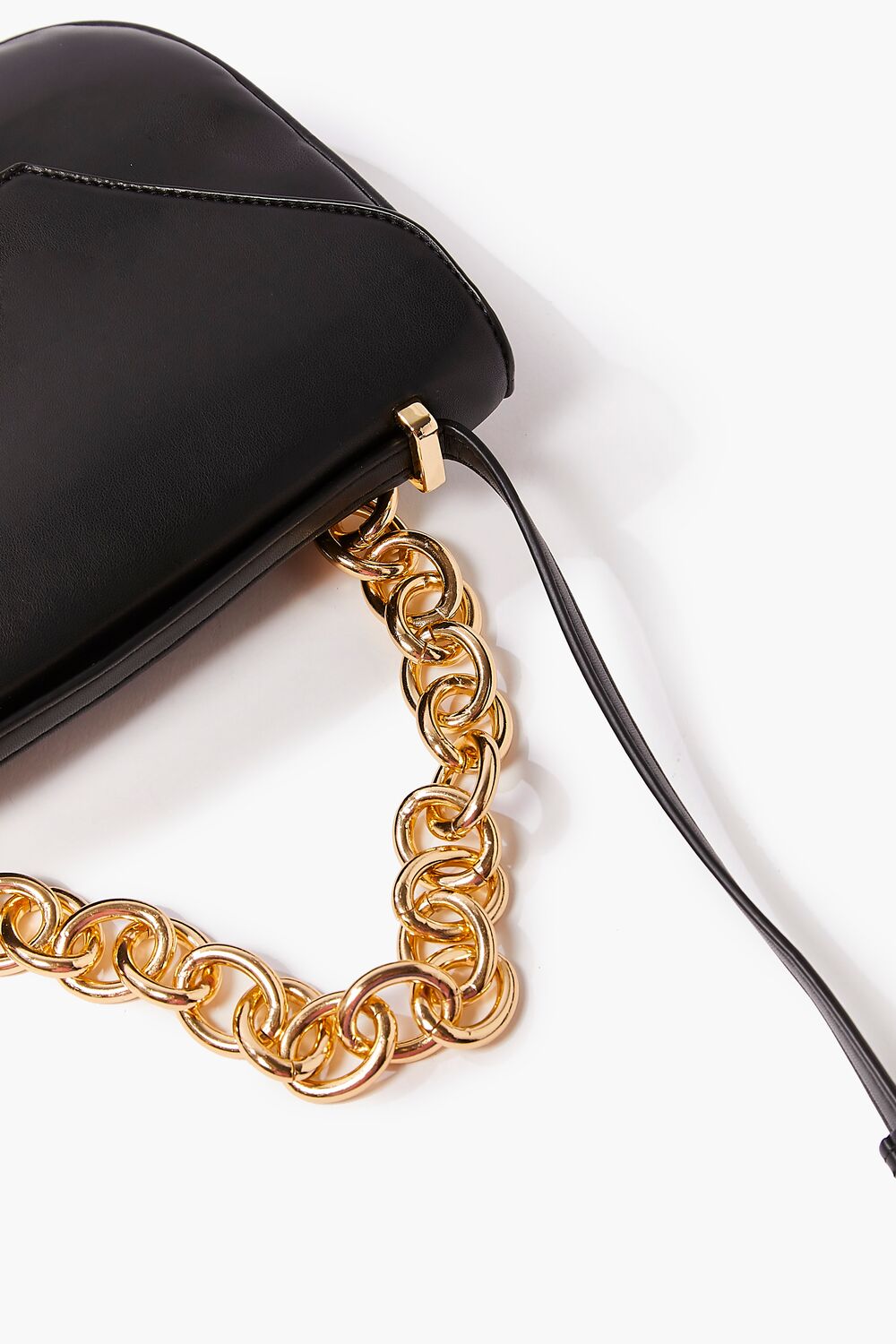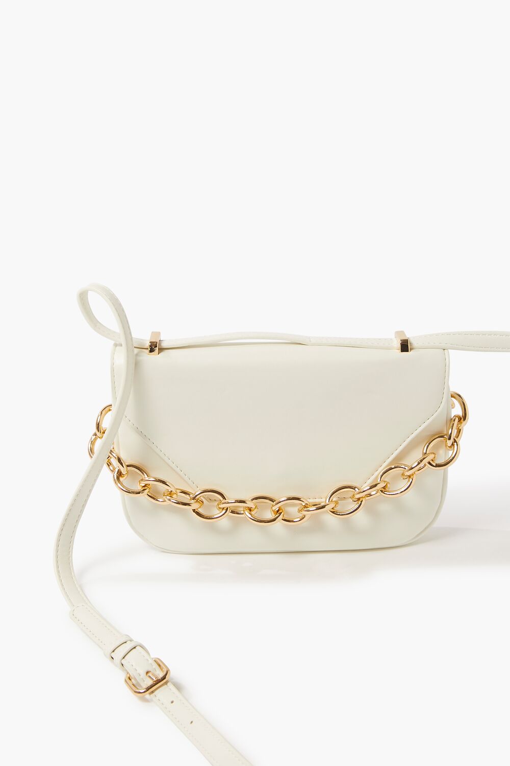 A faux leather crossbody bag featuring high-polish hardware. colorblock design. a curb chain top handle. flap top. adjustable strap. and a structured body.