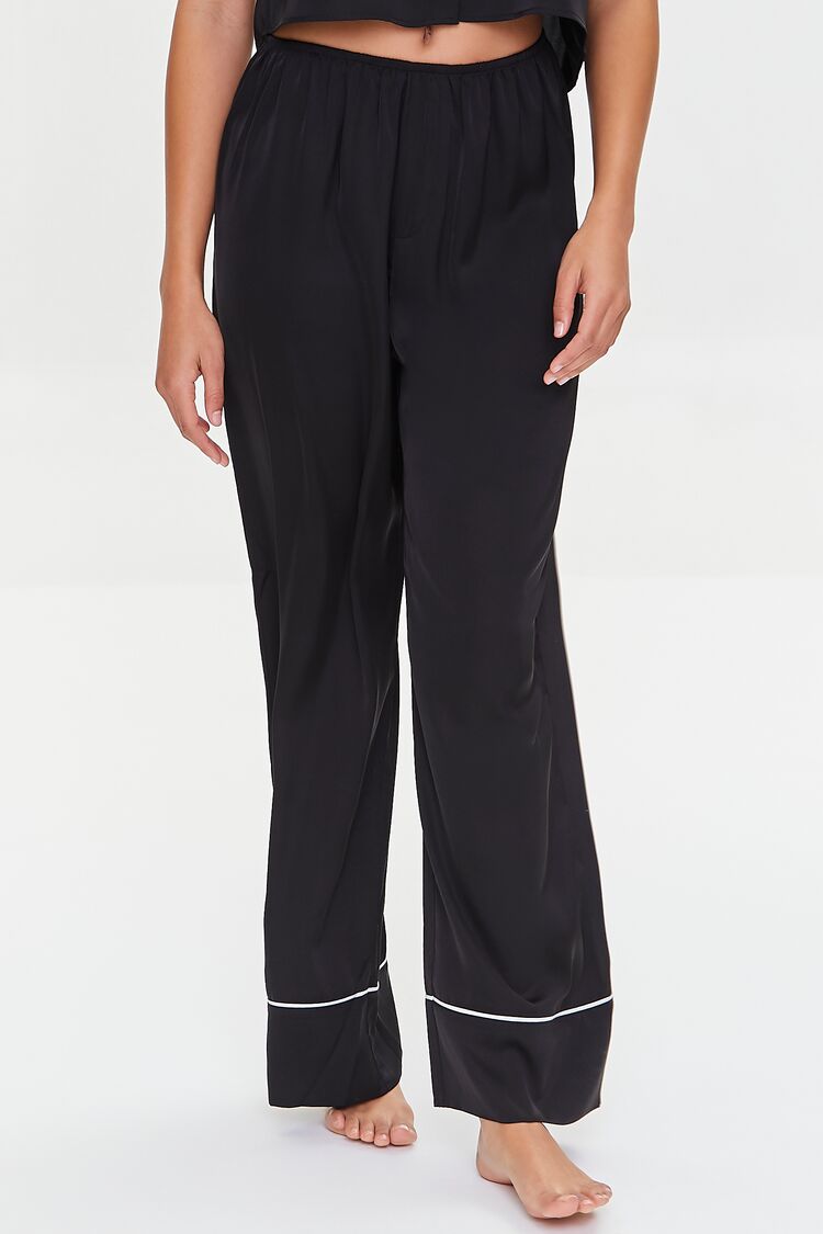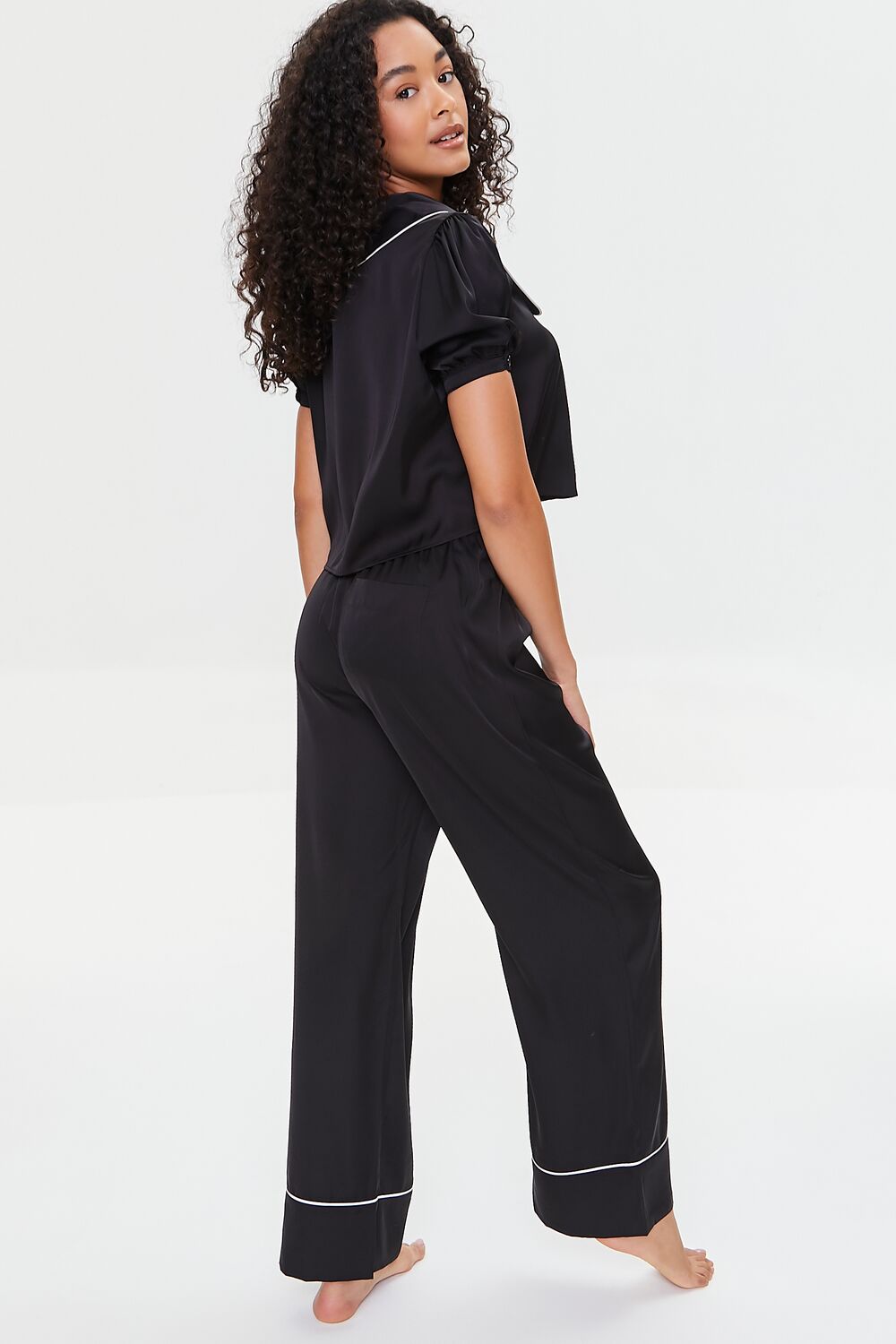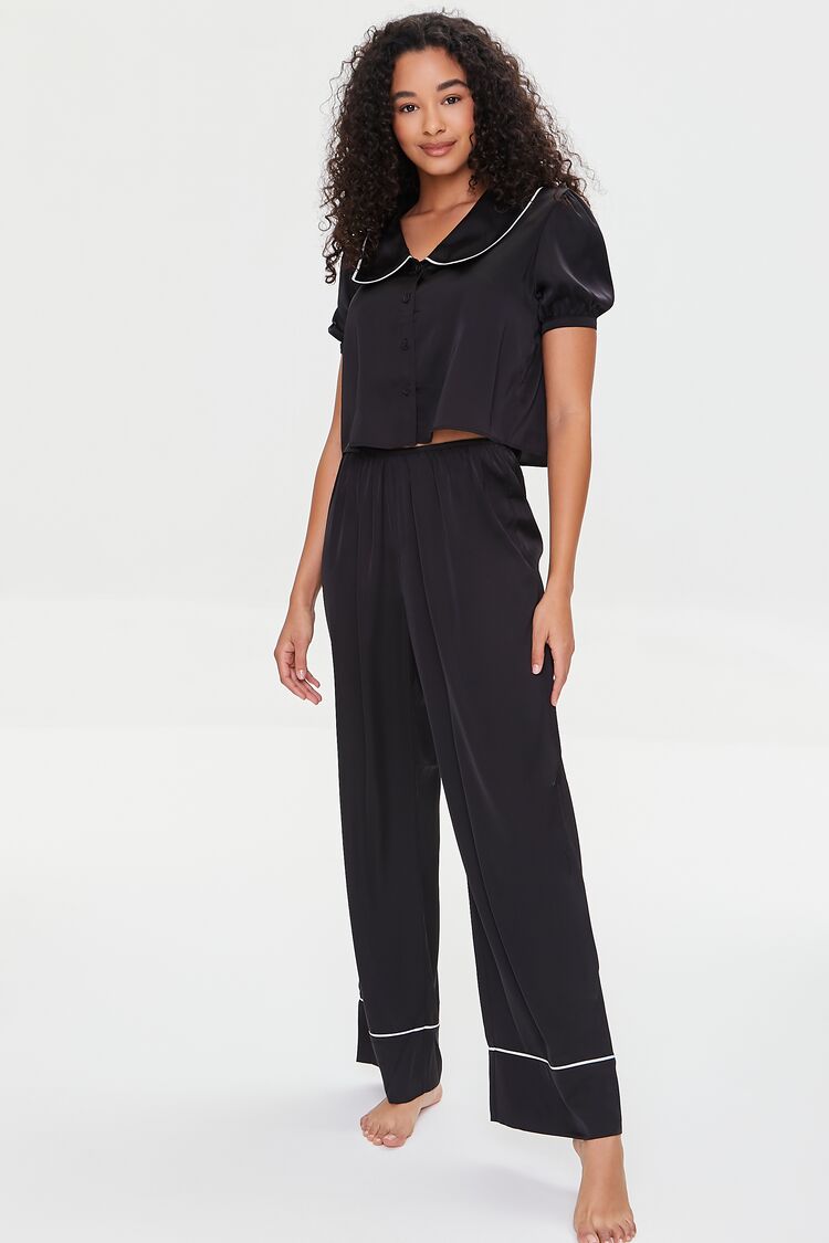 A woven set featuring a shirt with short sleeves. a rounded collar. contrast piped trim. button-up front. and a cropped hem. as well as a pair of matching pants with elasticized waistband and a back patch pocket.